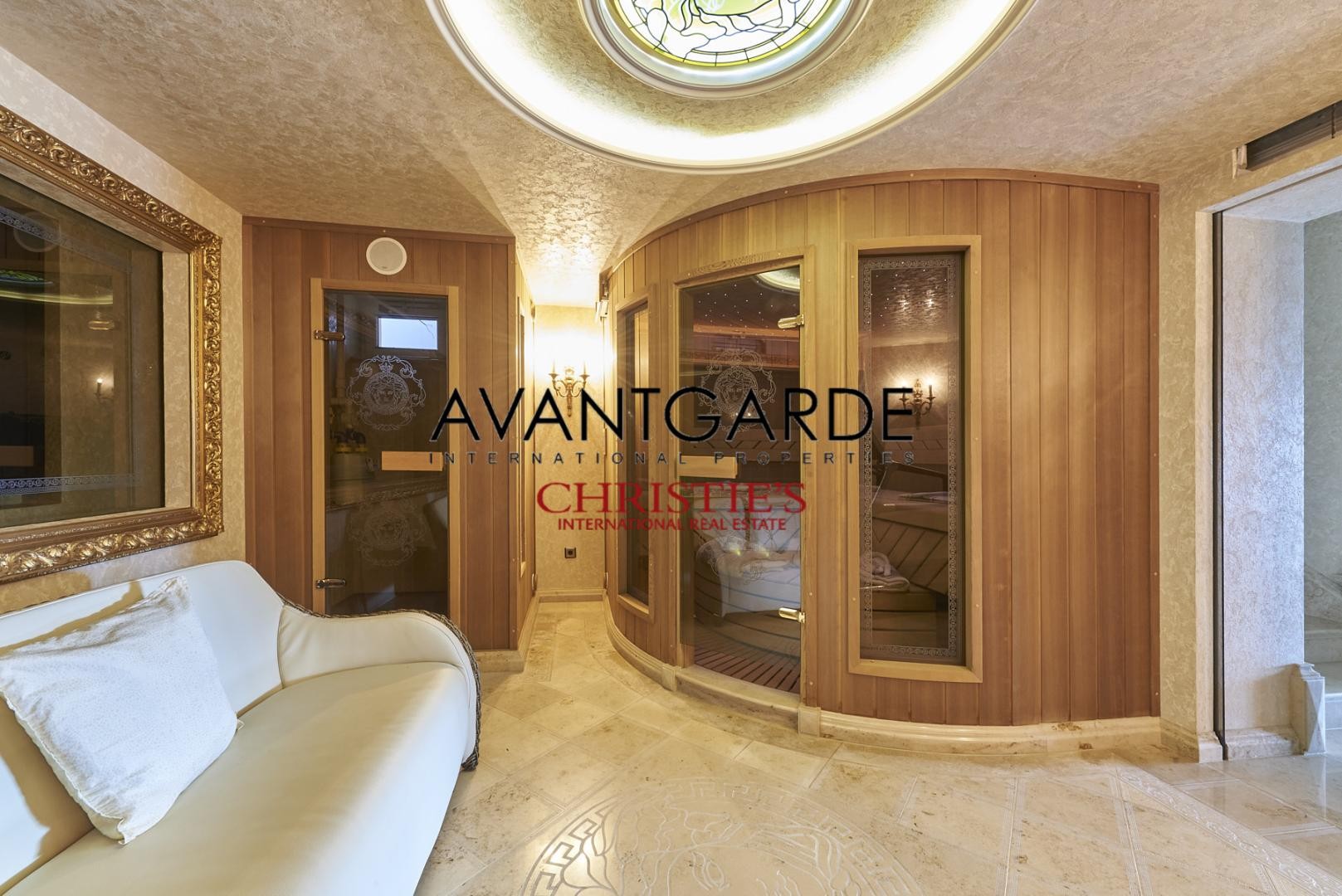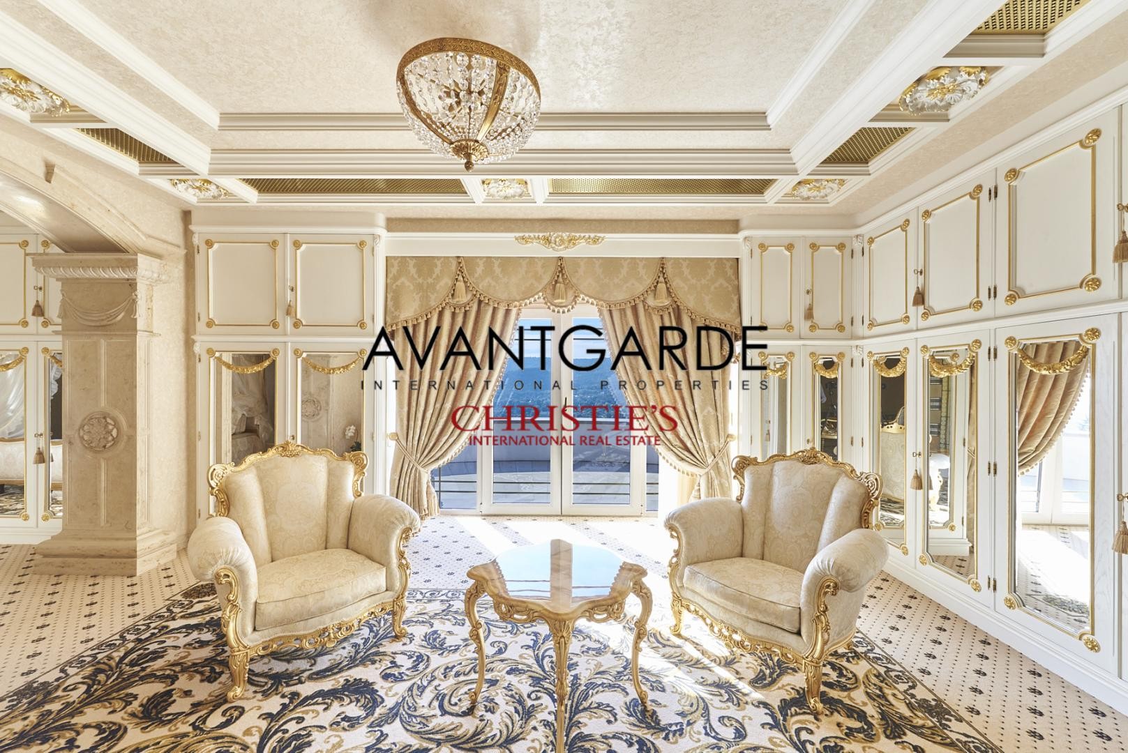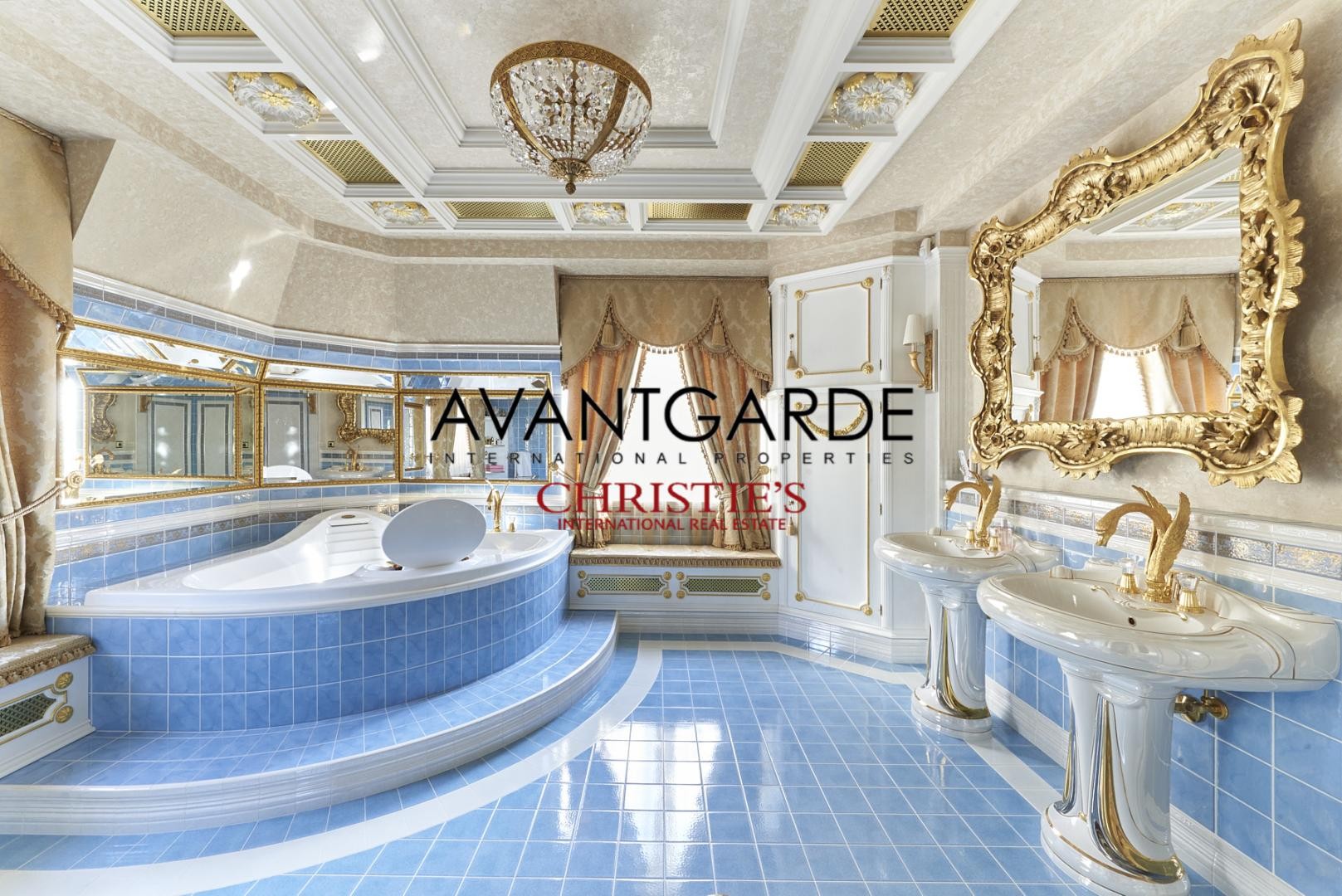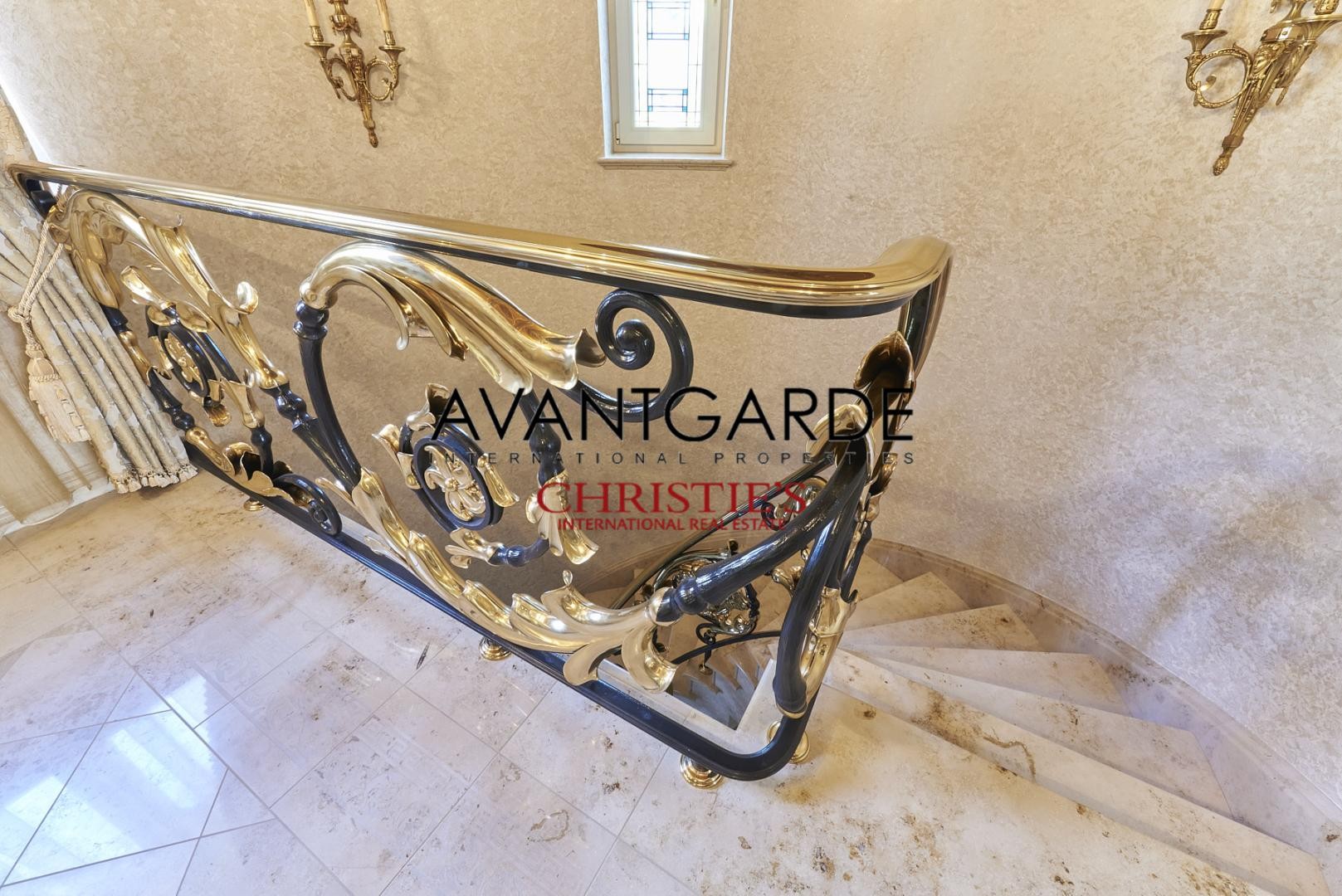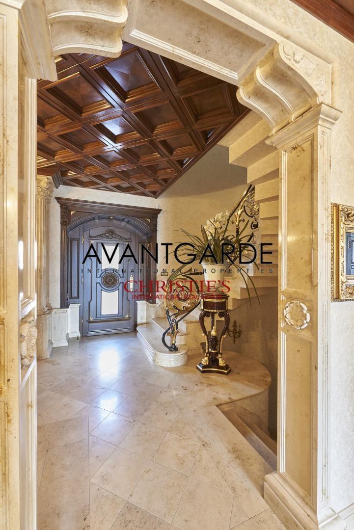 The entire villa impresses with exceptional stucco, glass mosaic by Bisazza as well as hand-carved Corinthian columns made of Jura stone and has Mariner chandeliers, wall chandeliers, Swarovski crystal, Jado and Angello Capellini furniture.