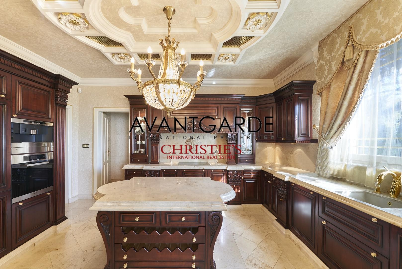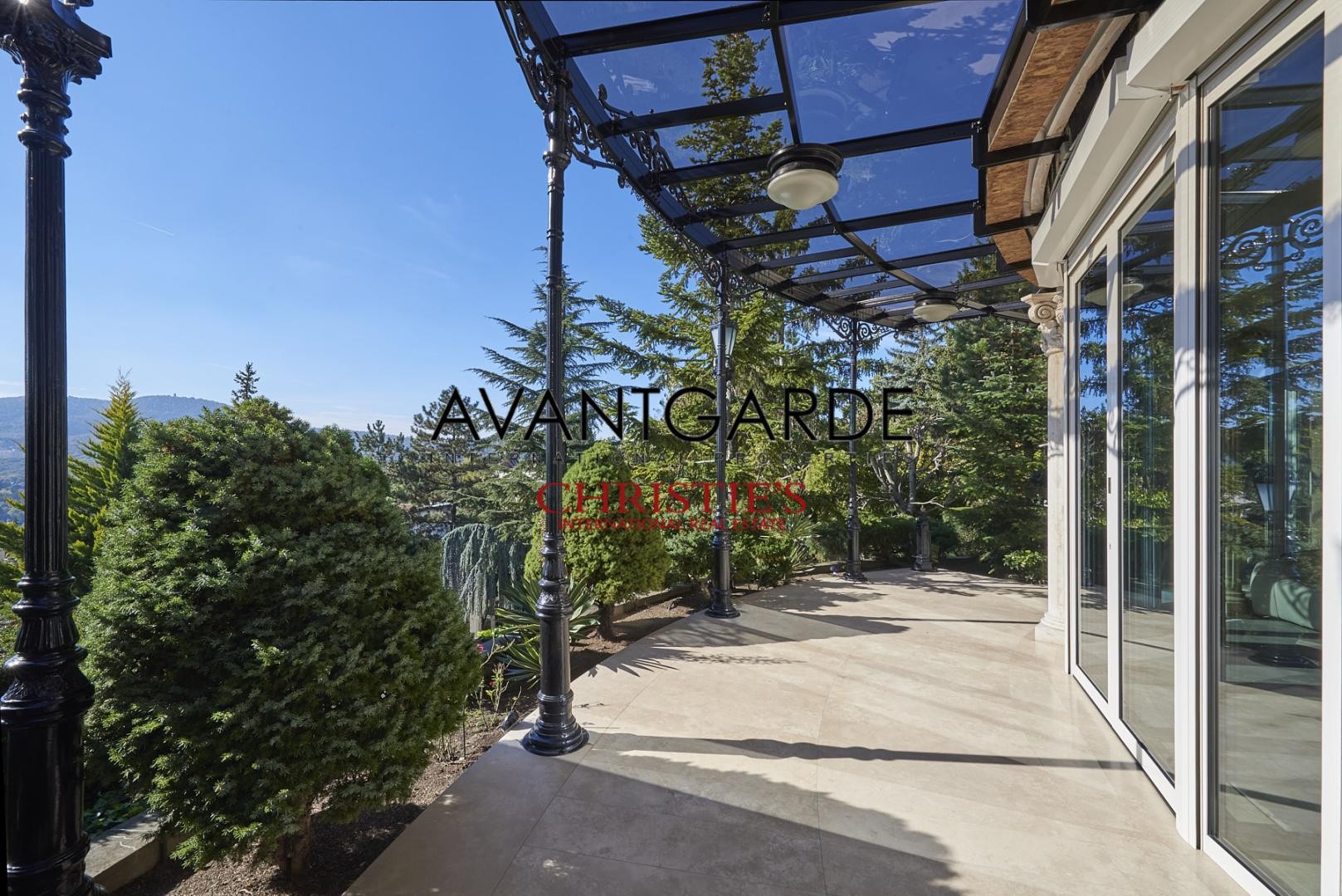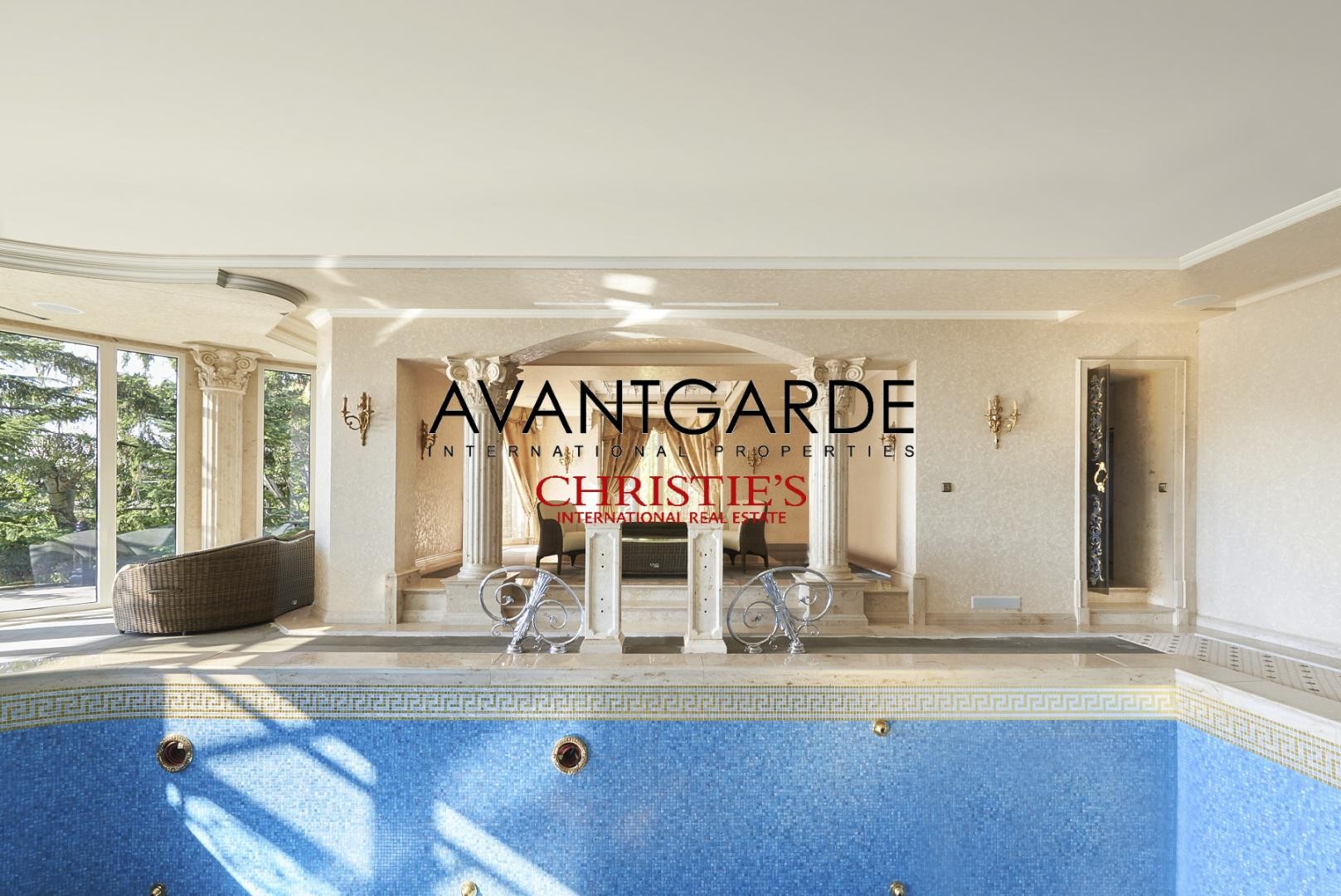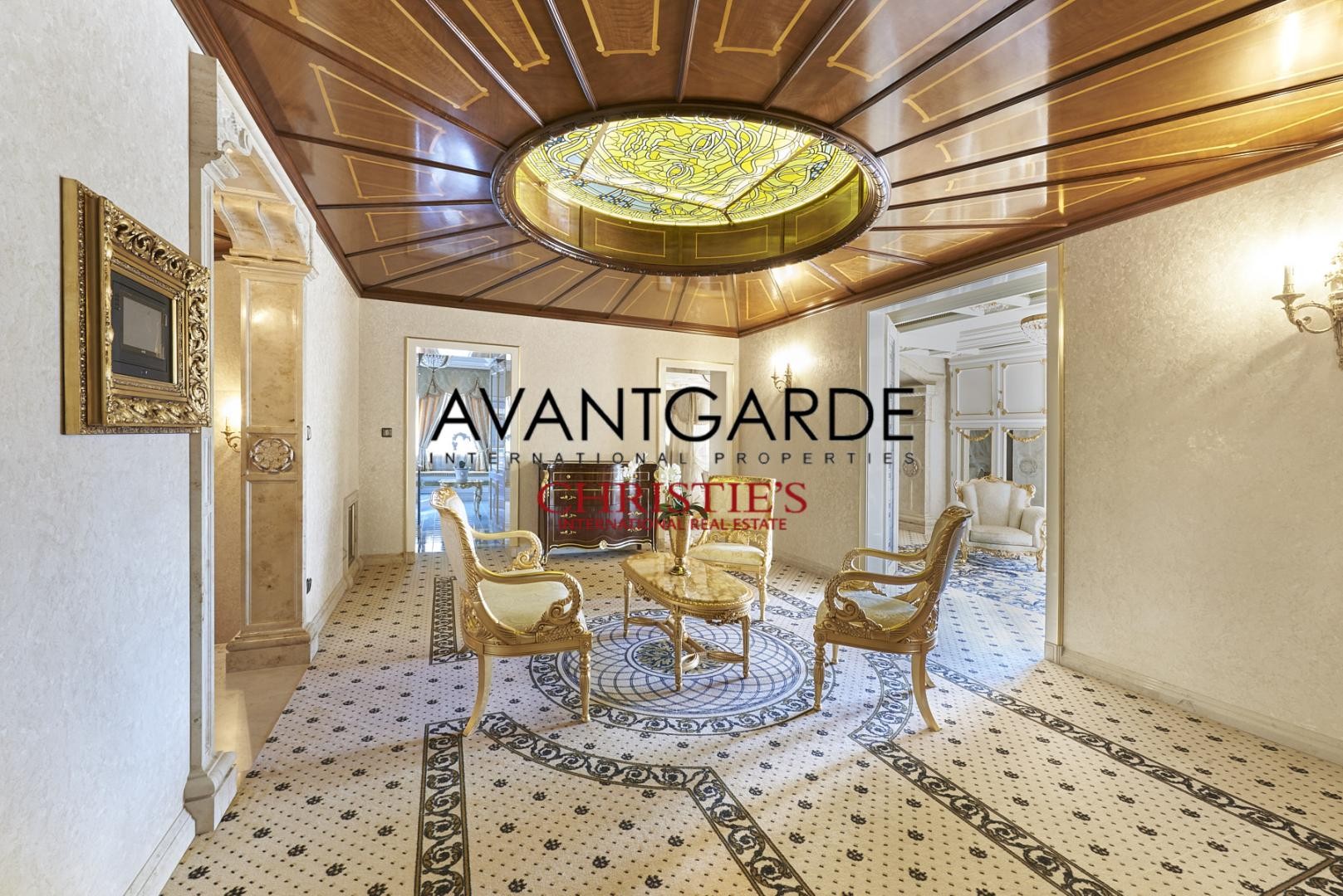 The entire villa impresses with exceptional stucco, glass mosaic by Bisazza as well as hand-carved Corinthian columns made of Jura stone and has Mariner chandeliers, wall chandeliers, Swarovski crystal, Jado and Angello Capellini furniture.