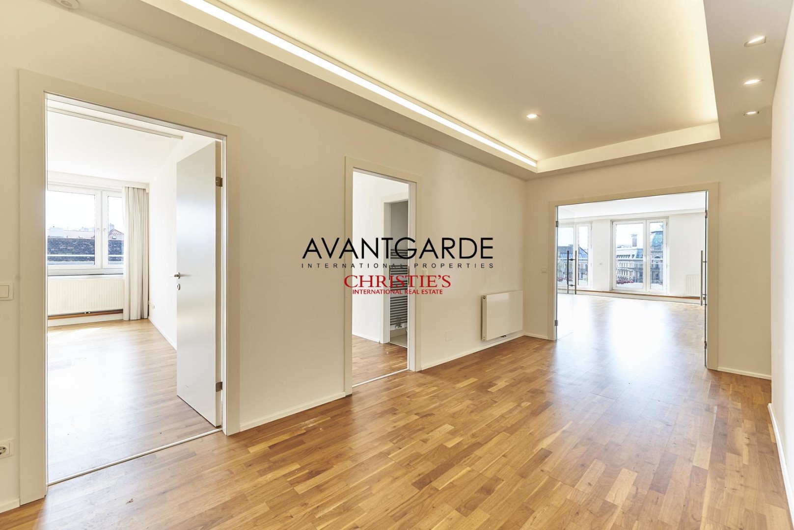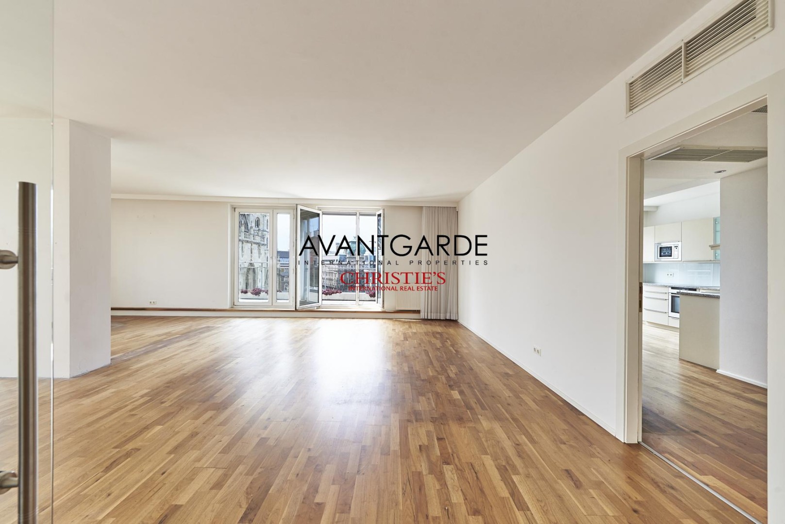 Beim Betreten dieses Apartments empfängt Sie ein geräumiges Entree, das nahtlos in den weitläufigen Wohnbereich mit Blick auf den schönsten Platz Wiens übergeht.