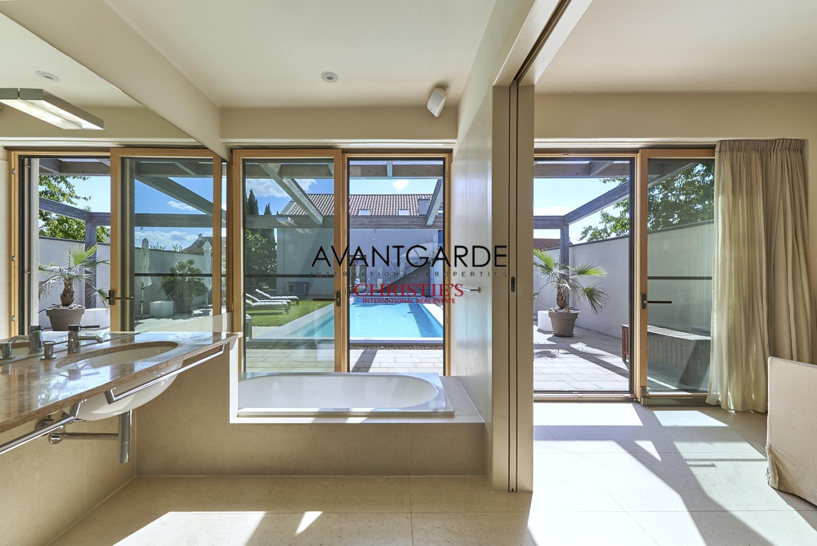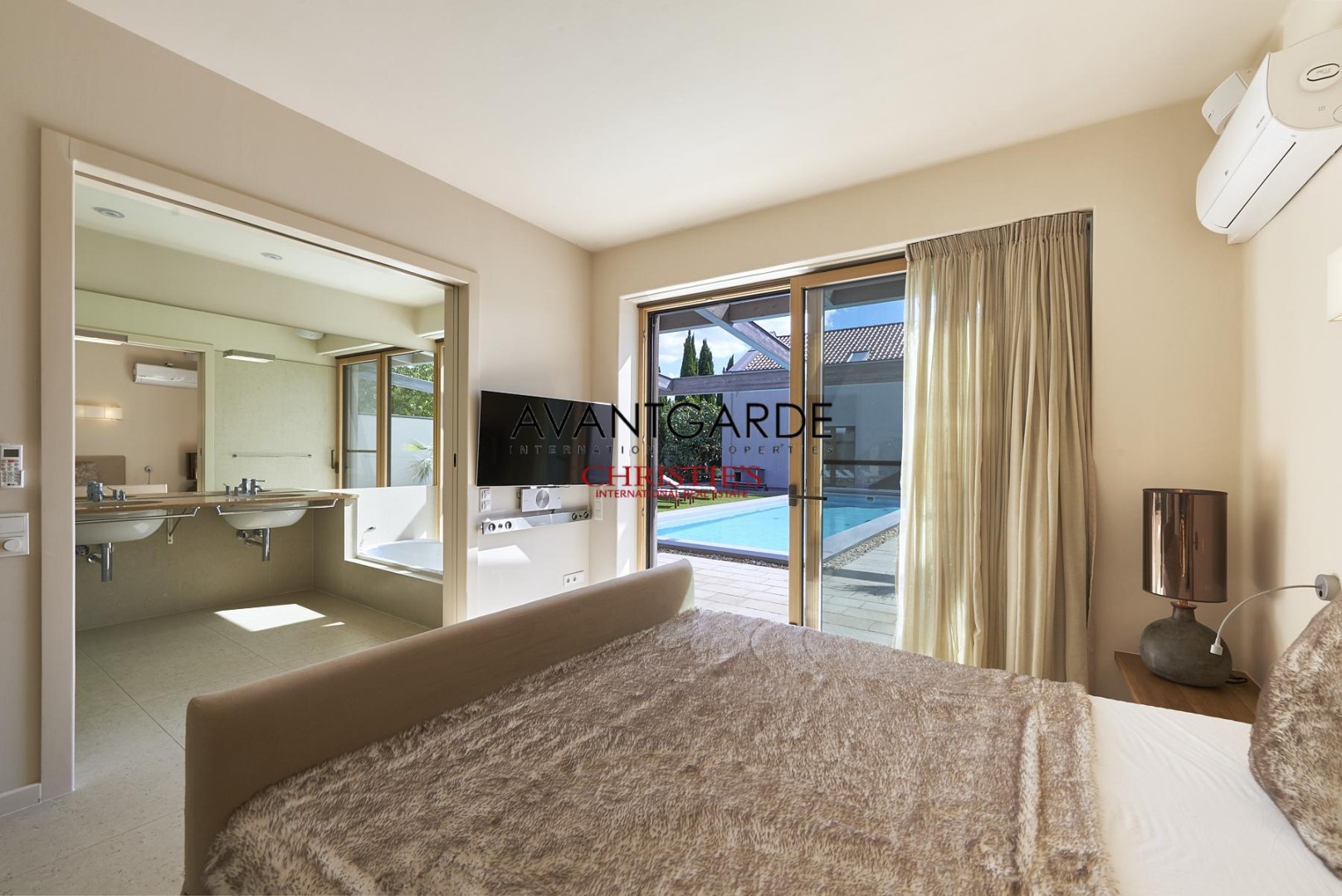 Im Erdgeschoss des Haupthauses erwartet Sie das Masterschlafzimmer mit Bad en suite und direktem Zugang zum Garten und zum 12m langen beheizten Pool, sowie zwei weitere Schlafzimmer, ein Bad und ein Gäste-WC. Großzügige Marmorböden und maßgefertigte Einbauschränke vereinen Stil und Funktionalität auf höchstem Niveau. Das Obergeschoss verfügt über eine große Suite mit ca 40m2, das ebenfalls noch als Schlafzimmer gestaltet werden kann.