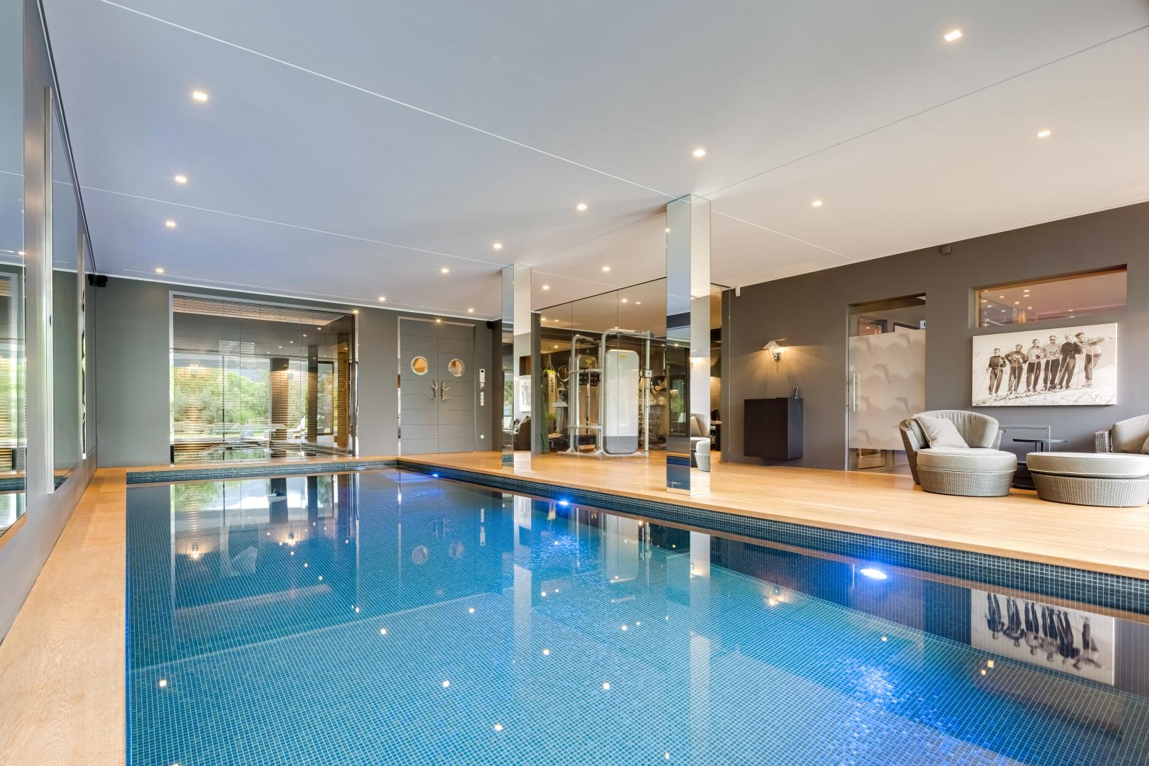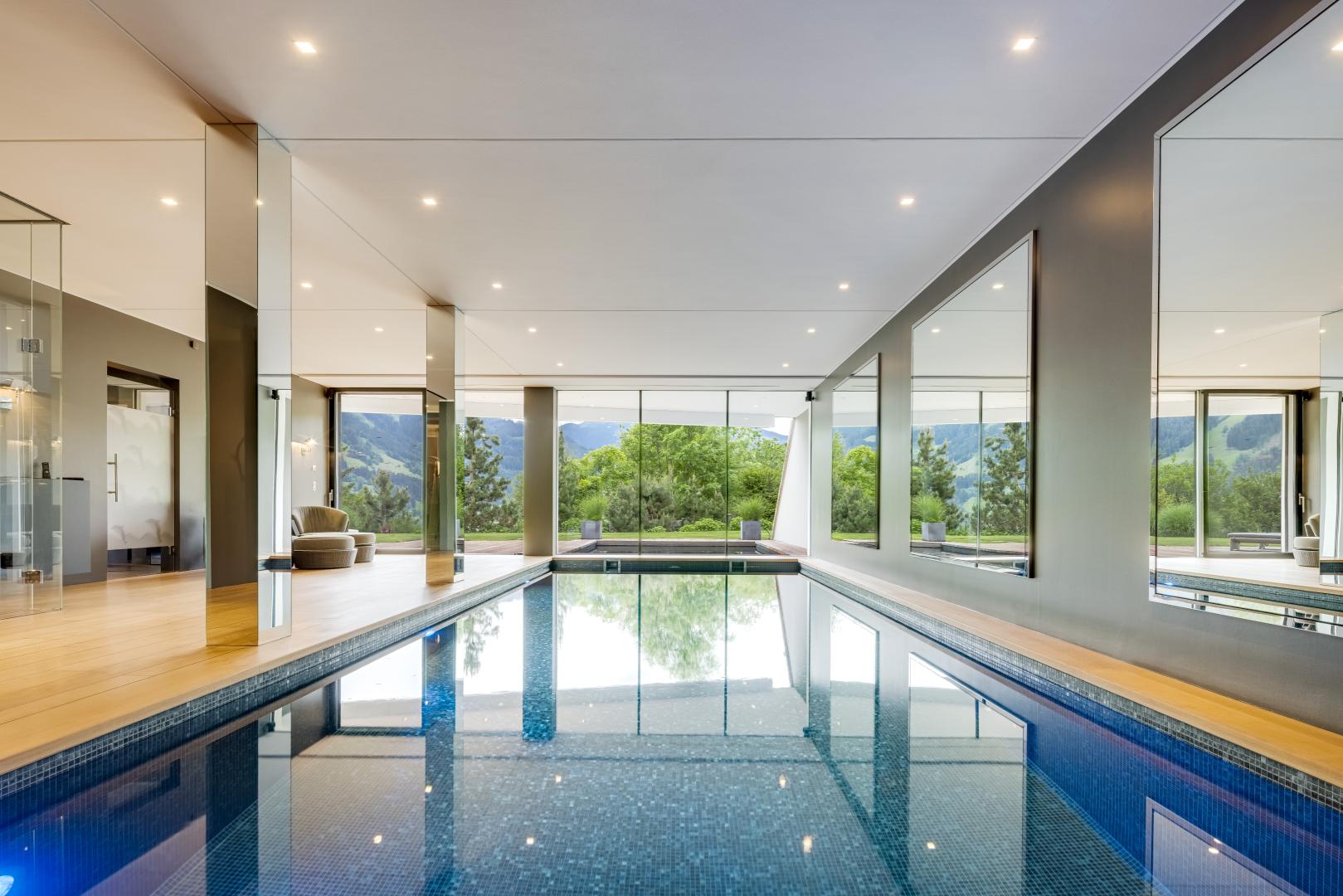 Im Untergeschoss befinden sich zwei Schlafzimmer mit Bad en Suite, ein Weinkeller, ein Hauswirtschafsraum und Kühlraum sowie weitere Lagerräume mit ausreichend Stauraum. Das Highlight auf dieser Ebene ist der Wellnessbereich mit Indoorpool, Sauna, Fitness, Ruhebereich