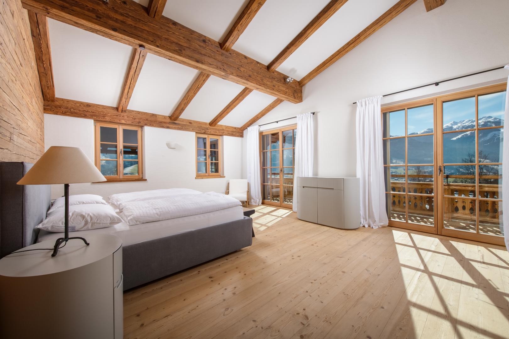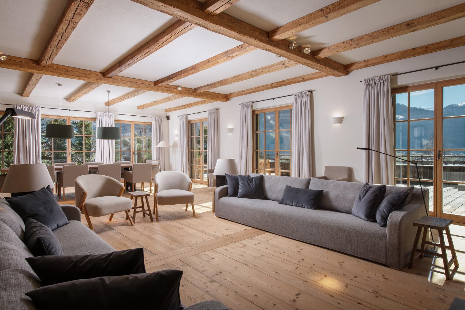 Das im traditionellen Stil errichtete Chalet bietet im Innenbereich ein modernes Ambiente mit höchstem Luxus und Komfort. Haupt- und Gästehaus sind geprägt von besonders hohen Räumen und lichtdurchfluteten Fenstern, schönen Dielenböden, hochwertig ausgestatteten