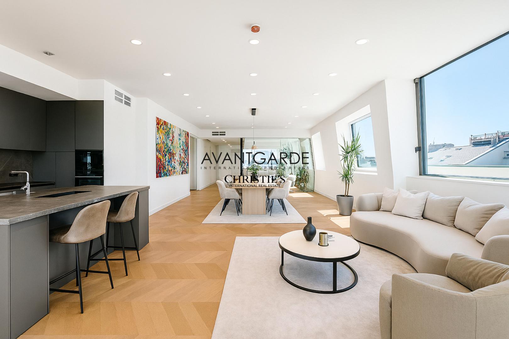 Schon beim Eintreten – der Lift führt direkt in die Wohnung – beeindruckt die Kombination aus erlesenen Materialien, modernster Technik und architektonischer Finesse. Der weitläufige Wohnbereich mit seiner außergewöhnlichen Formgebung und großen Fensterfronten ist das Herzstück des Penthouses. Die angrenzende Küche, offen gestaltet und dennoch dezent separiert, fügt sich harmonisch in das Gesamtkonzept ein. Der Blick auf die prächtigen Fassaden der Umgebung und die malerischen Dächer Wiens ist dabei ein ständiger Begleiter.