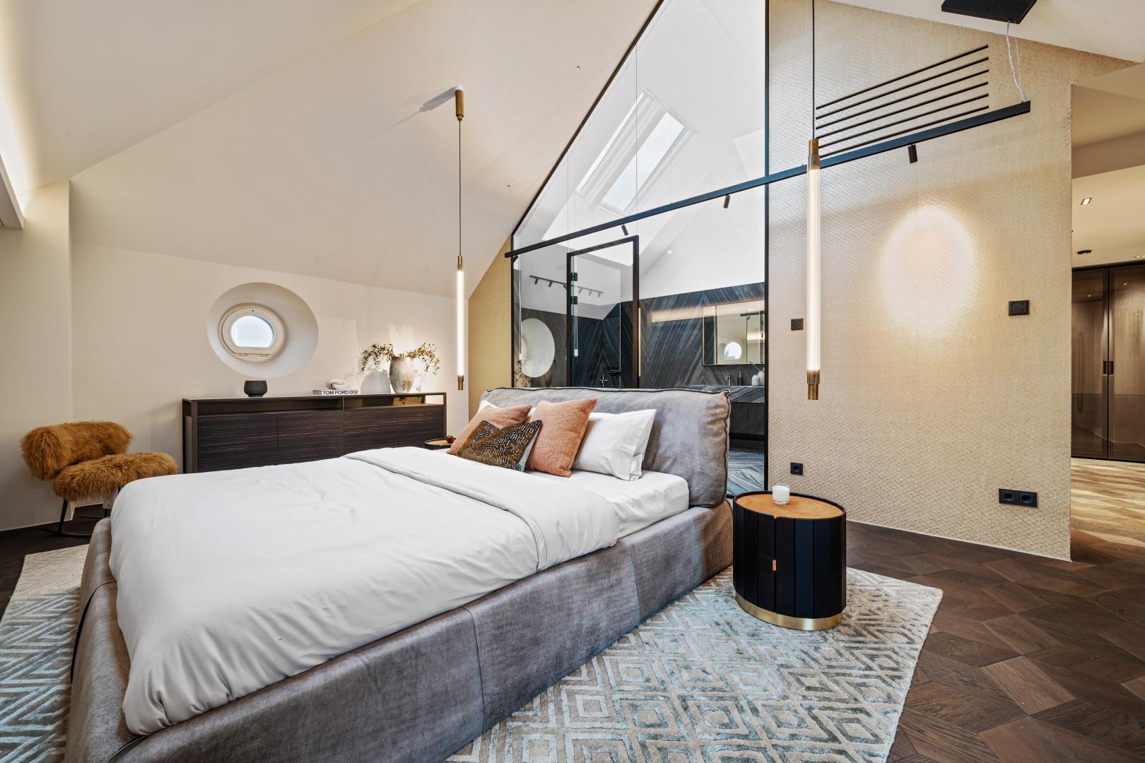 • Die außergewöhnliche Raumgestaltung des Schlafzimmers überzeugt mit einer beeindruckenden Raumhöhe von bis zu 4,50 m, die ein Gefühl von Weite und Freiheit vermittelt.