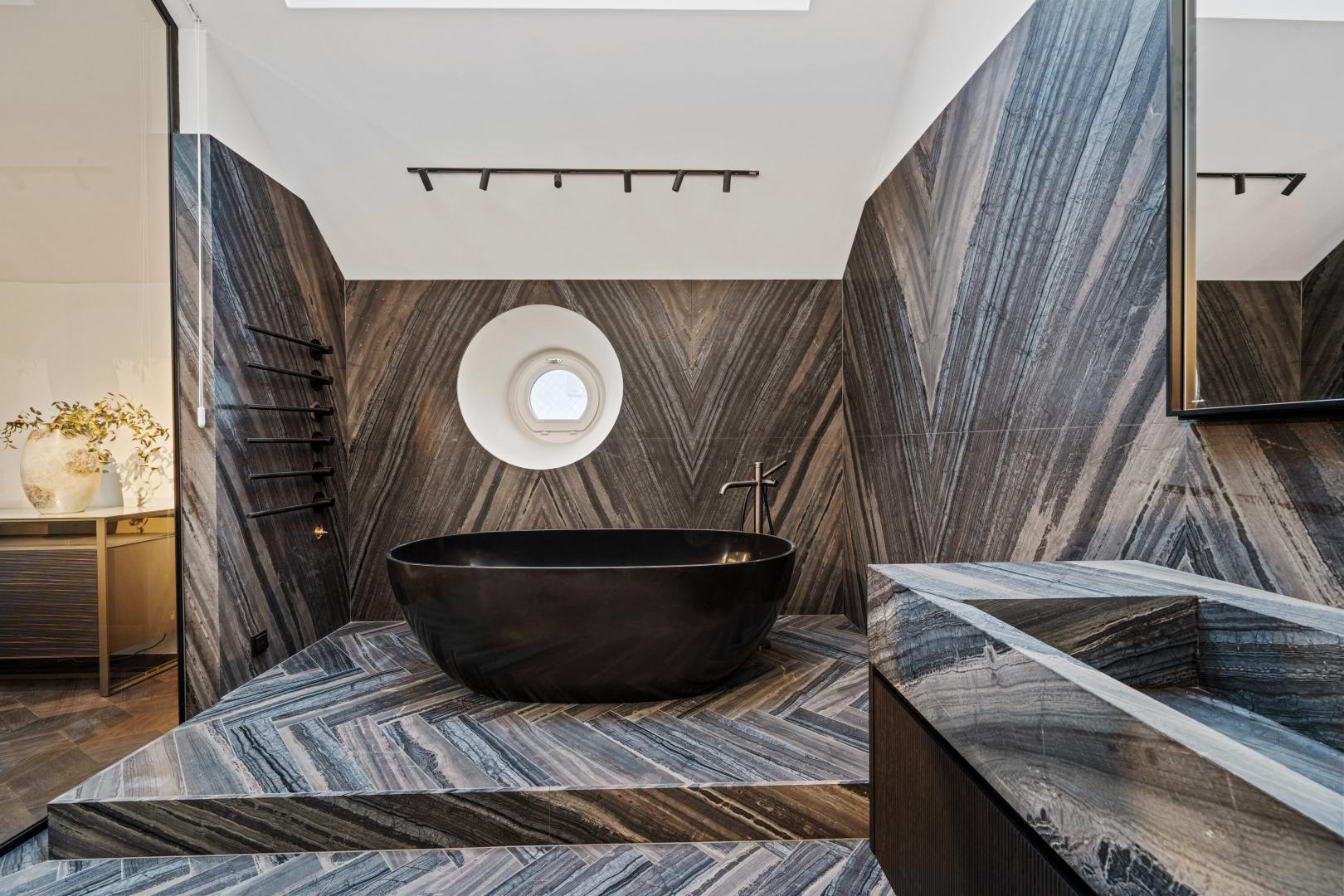 • Das Badezimmer, ausgestattet mit Marmor von Antolini aus Italien, Dusche, WC, freistehender Badewanne und Sanitärgegenständen von Gessi sowie einem Handtuchheizkörper von Vola lässt dieses Bad keine Wünsche offen.