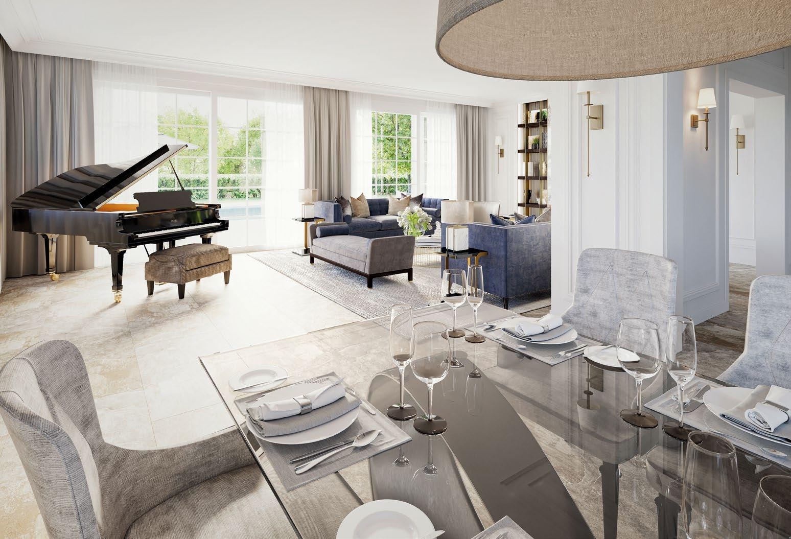 Das Obergeschoss bietet drei großzügige Schlafzimmer. Das Master-Schlafzimmer beeindruckt mit einer eigenen Garderobe sowie einem eleganten Bad en Suite, das mit hochwertigen Materialien ausgestattet ist. Vom Master-Schlafzimmer aus haben Sie zudem Zugang zu einem privaten Balkon.