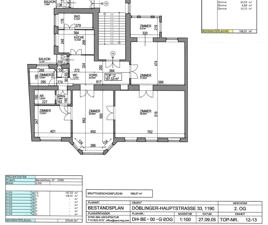 Diese großzügige Altbauwohnung befindet sich im zweiten Obergeschoss eines gepflegten Gründerzeithauses in der Döblinger Hauptstraße 33, im 19. Wiener Gemeindebezirk. Die Wohnnutzfläche beträgt rund 167,53 m² und verteilt sich auf insgesamt sechs Zimmer. Dank der hohen Decken, der großen Fenster und des klassischen Altbaucharakters wirkt die Wohnung besonders hell und einladend.