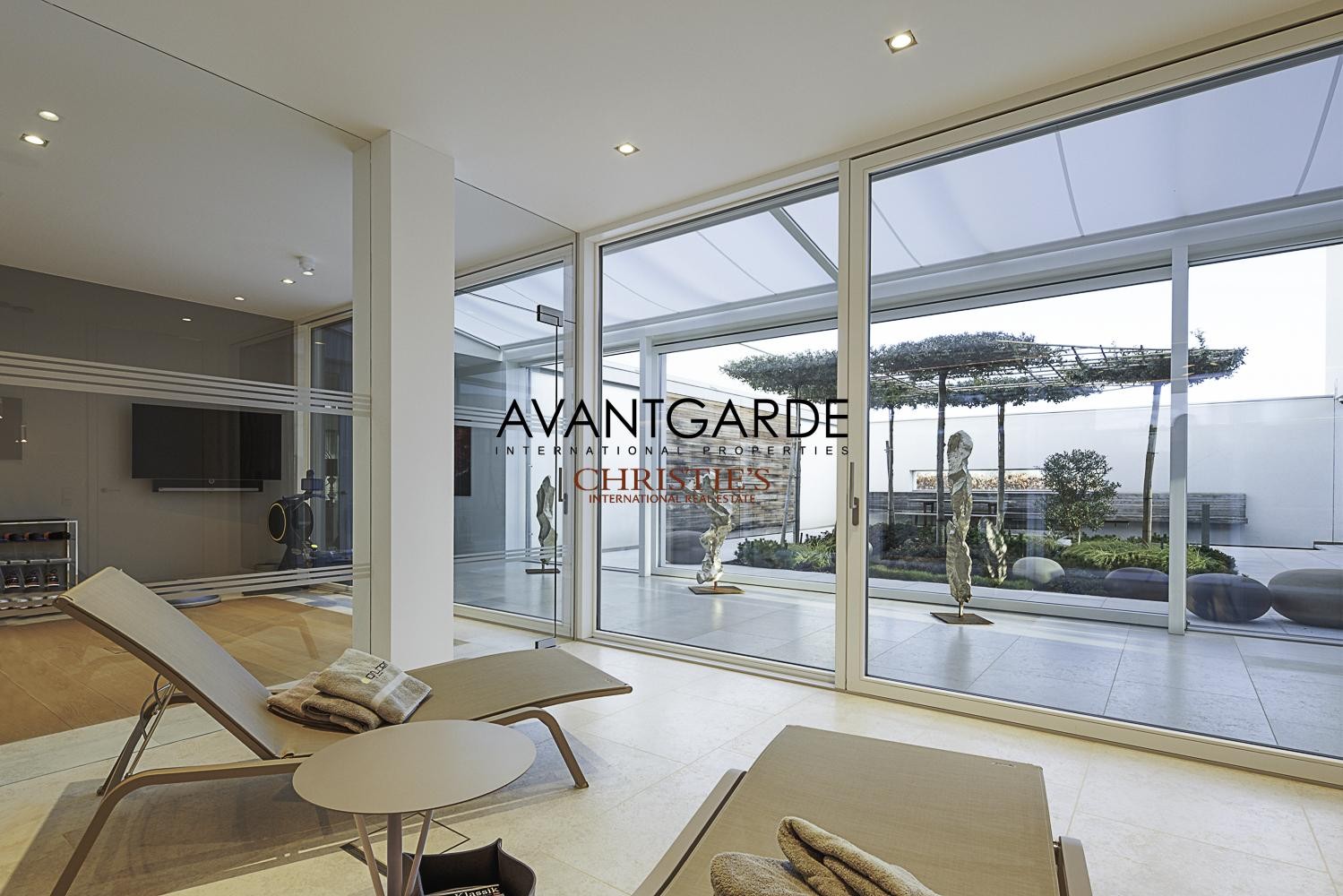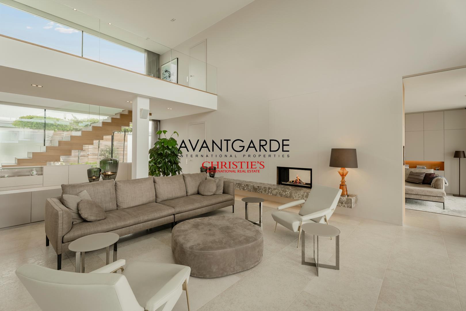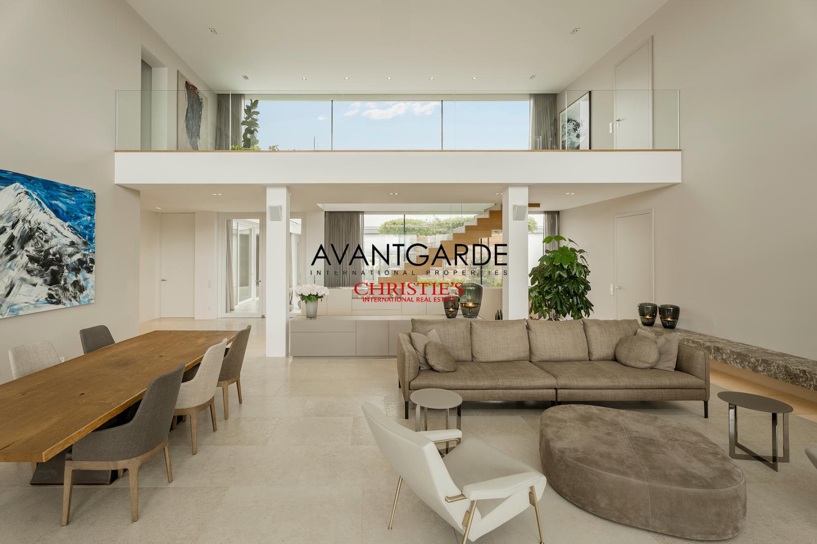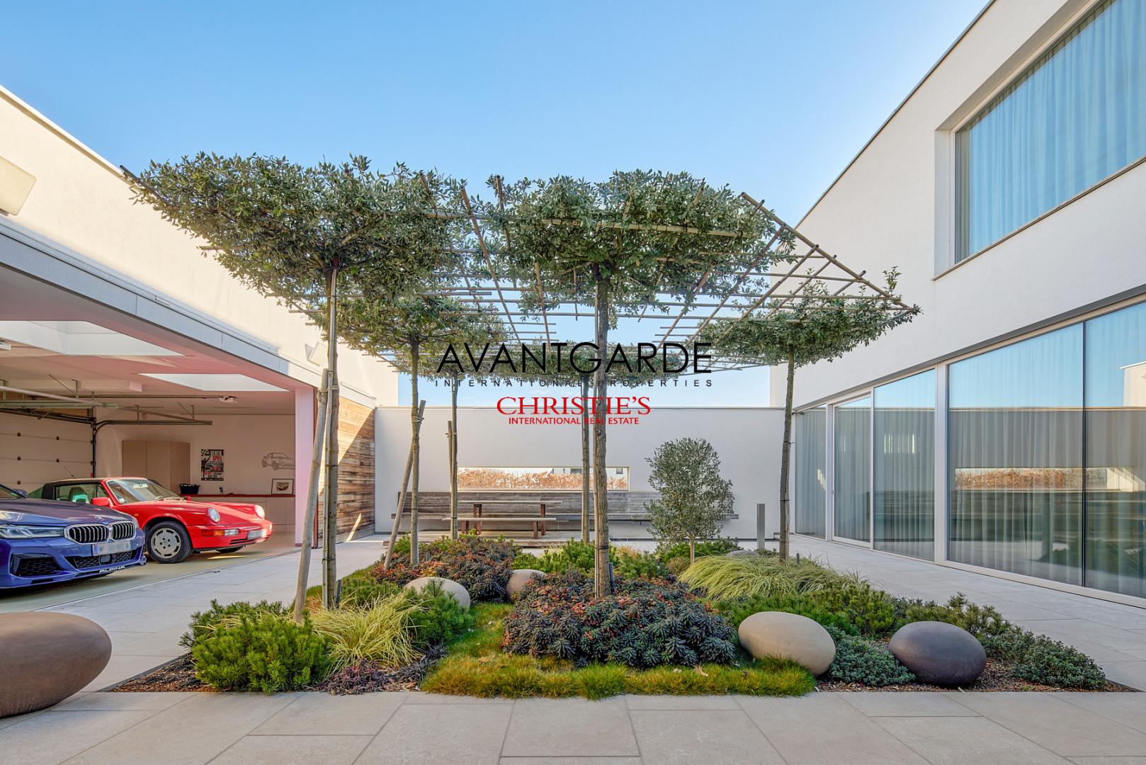 Der Hauptwohnbereich mit einer Raumhöhe von 6 m öffnet sich zur Galerie und zum zentralen Atrium – ein Innenhofgarten mit Wasserbecken und Sitzbereich, der als grüne Oase, Raum für Kunstwerke oder Raum für gesellschaftliche Anlässe fungiert.