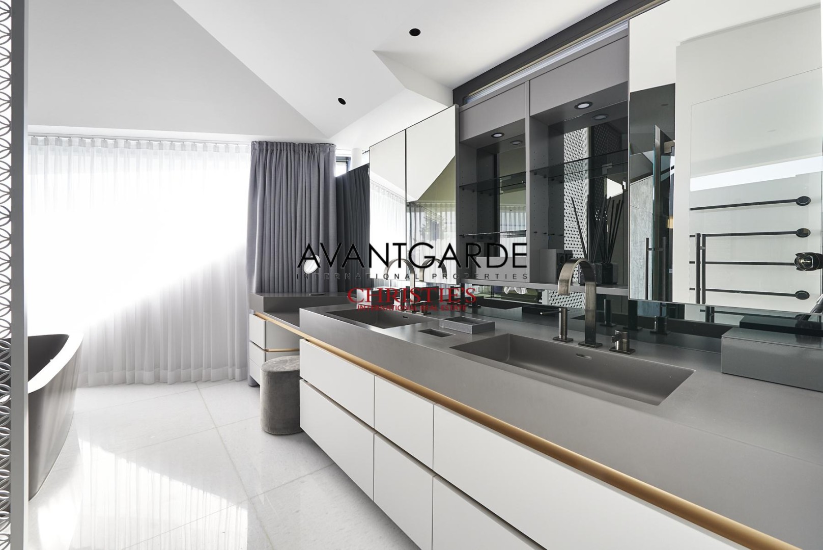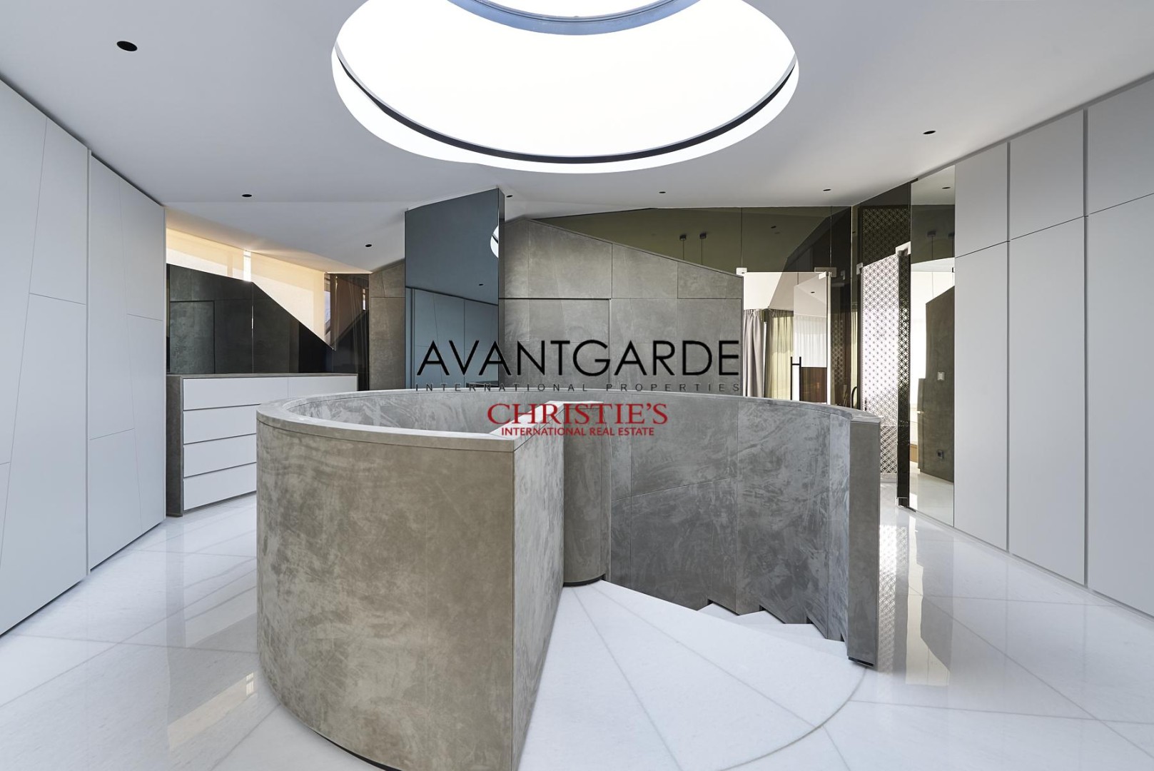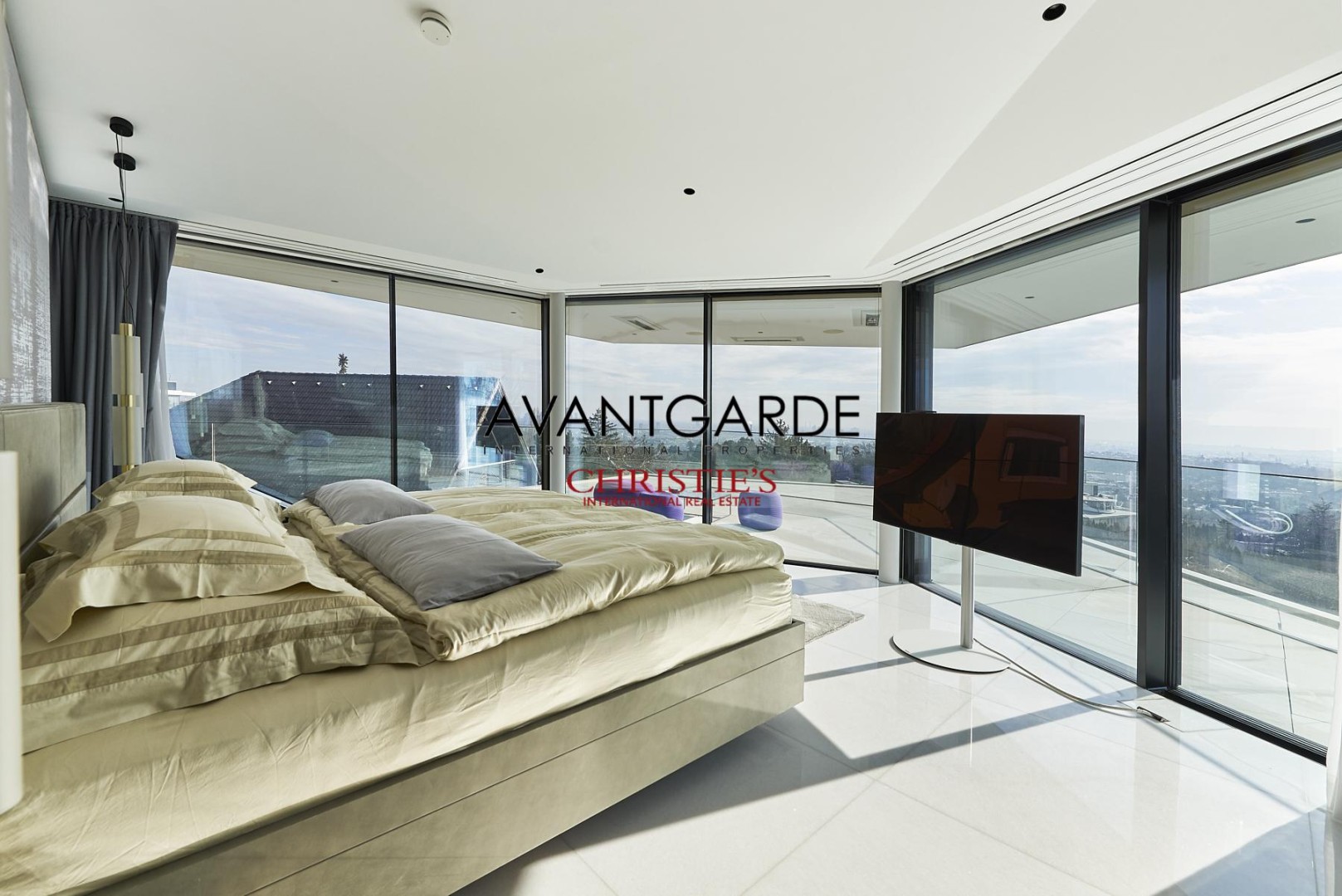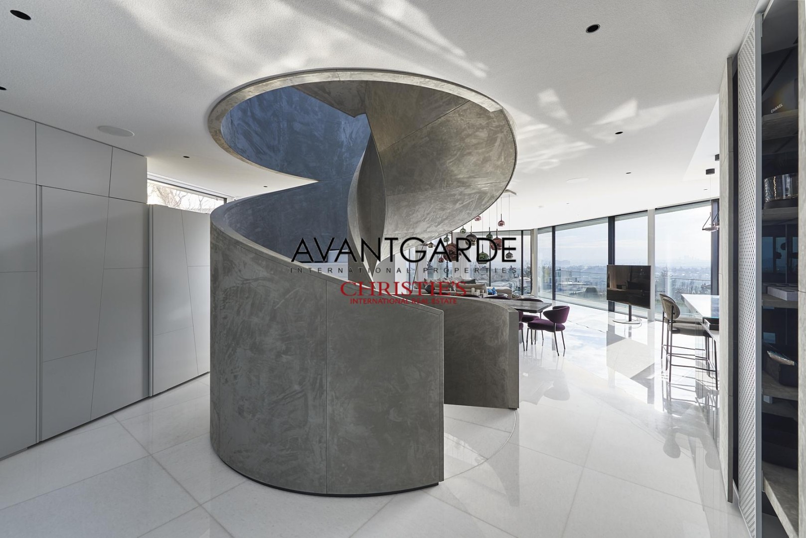 Das Obergeschoss bietet ein luxuriöses Hauptschlafzimmer mit en-suite-Bad und einem Ankleidebereich. Die angrenzende, südseitig ausgerichtete Terrasse bietet einen atemberaubenden Blick über die grüne Umgebung und die Skyline Wiens.