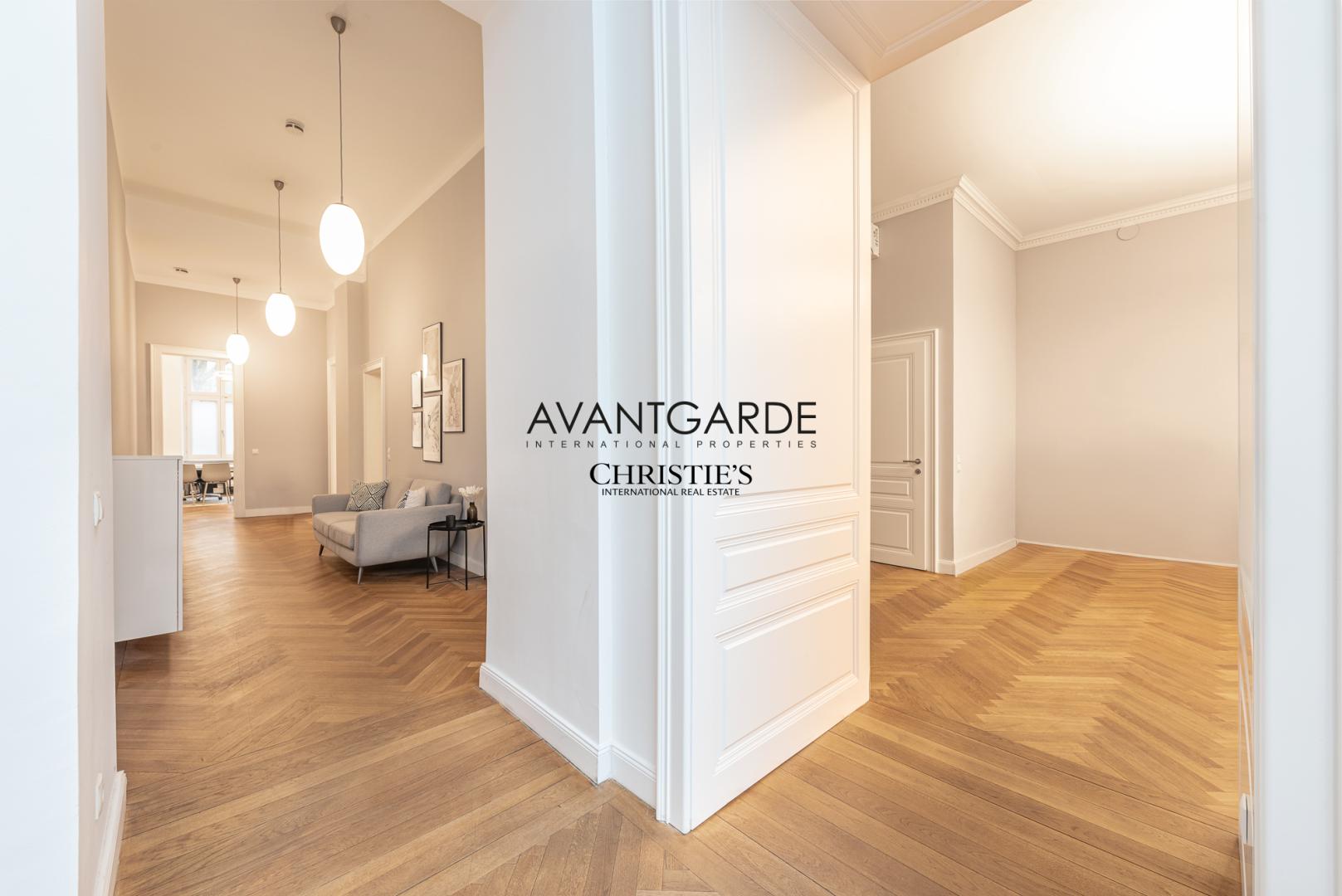 Diese renovierte Altbauwohnung vereint mit hohen Räumen, großen Fenstern, klassischem Parkett und Marmor Fliesen eine zeitlose Wohnatmosphäre.
