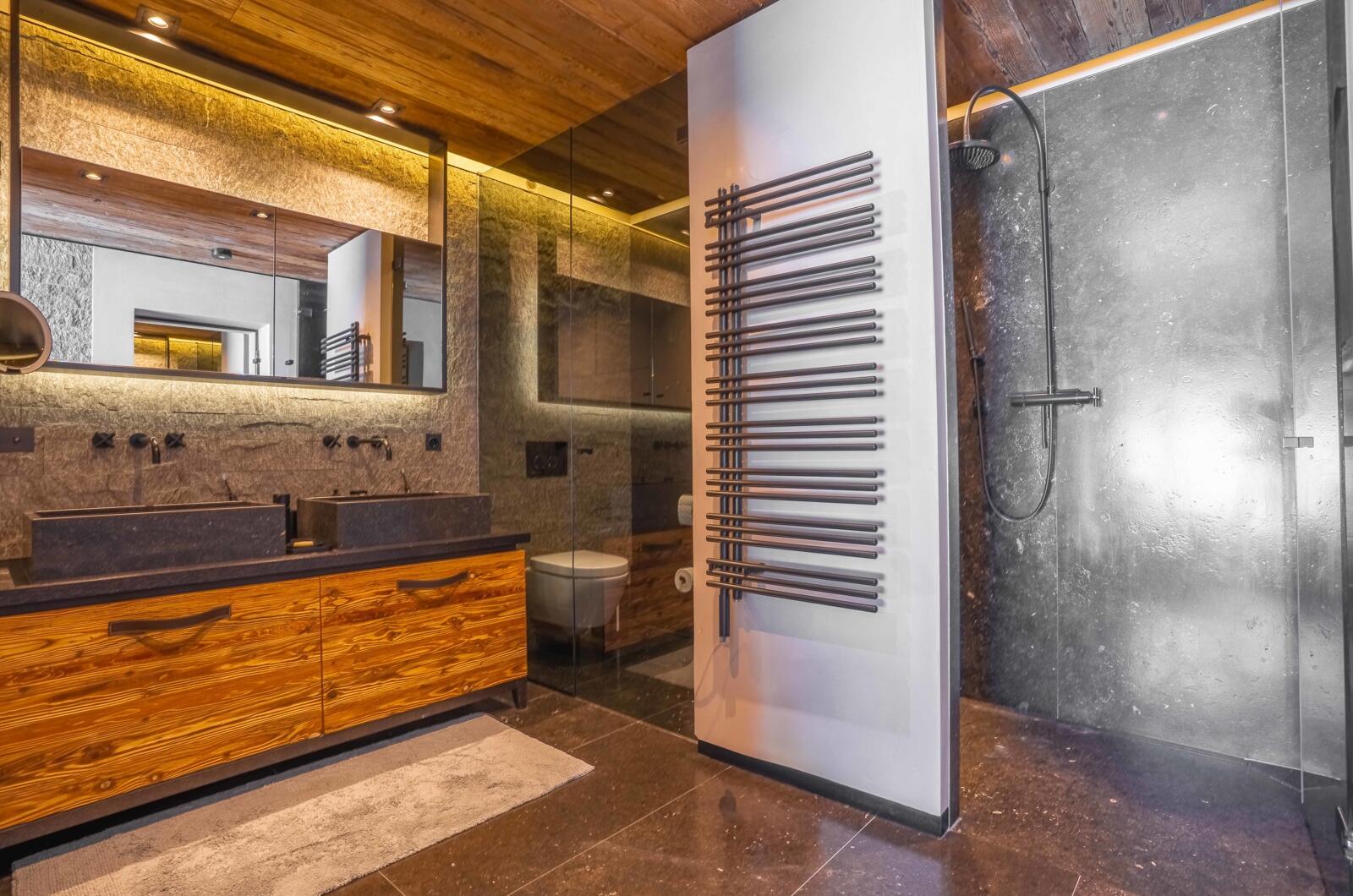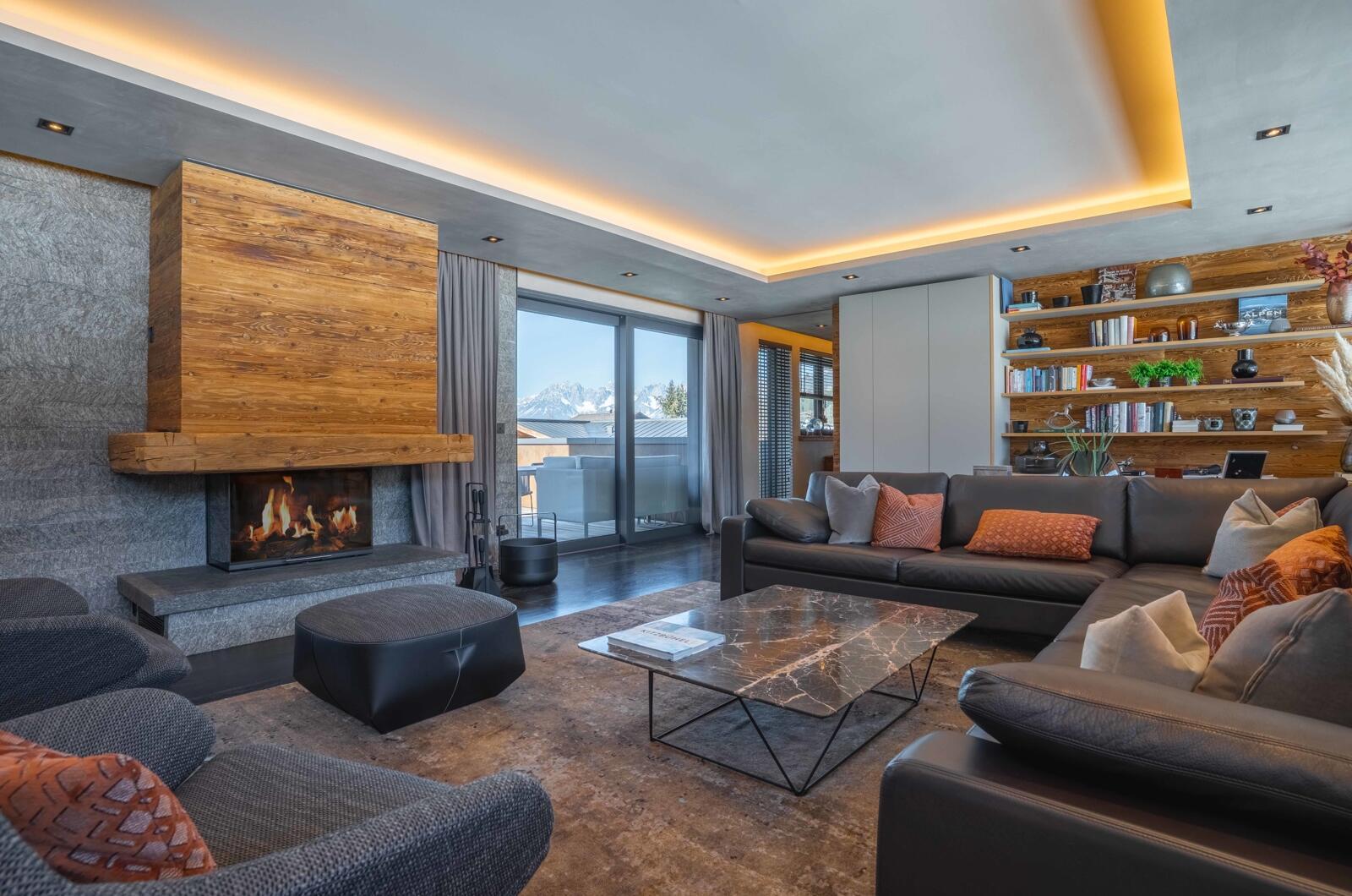 Drei Schlafzimmer sowie ein exklusiver Wellnessbereich mit separatem Gästebereich schaffen großzügigen Raum für Privatsphäre und Entspannung. Der Wohnbereich mit offenem Kamin und Zugang zur herrlichen Dachterrasse mit Whirlpool zeichnet sich durch erstklassige Verarbeitung, Ausstattung und Möblierung aus.