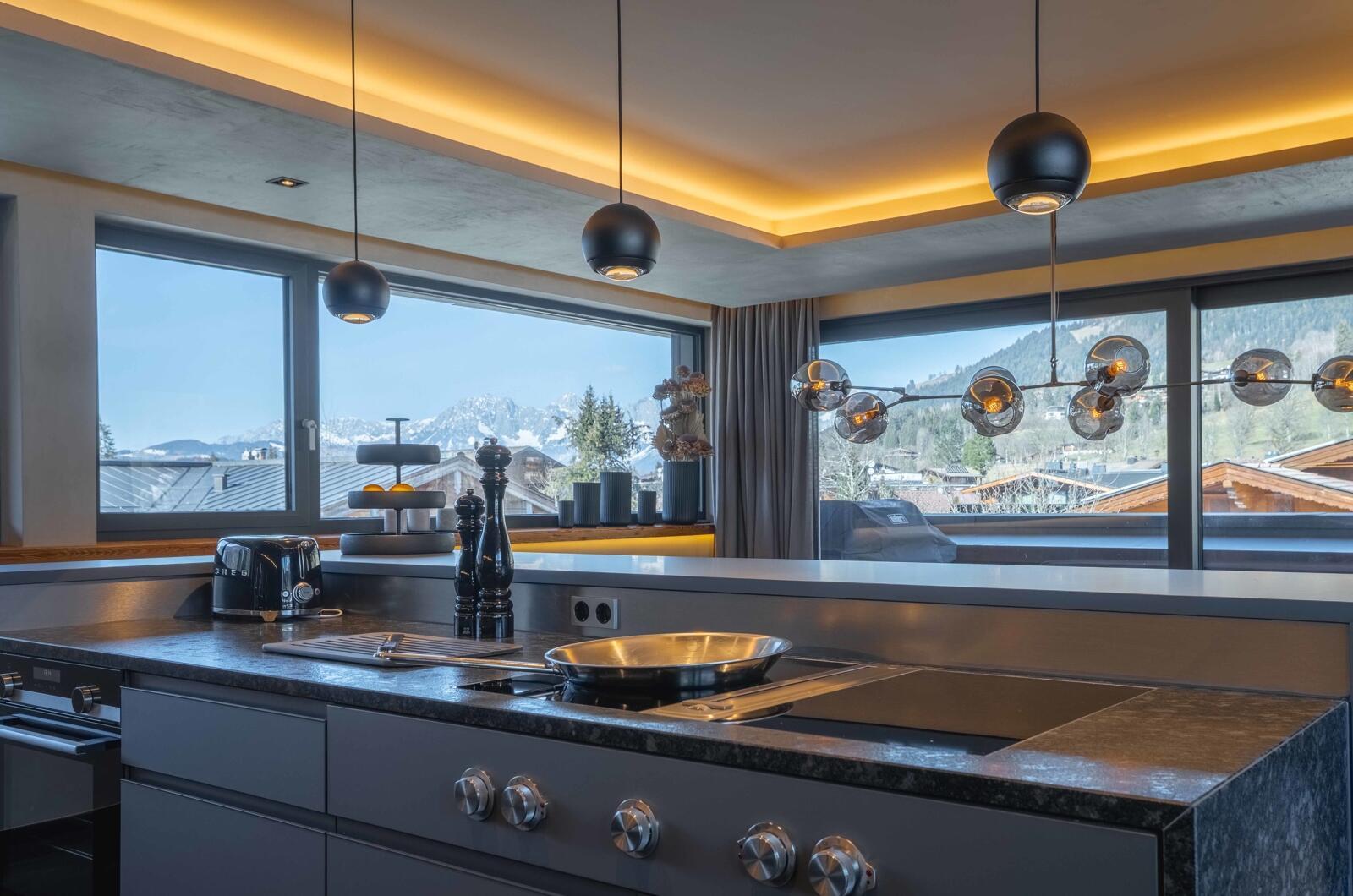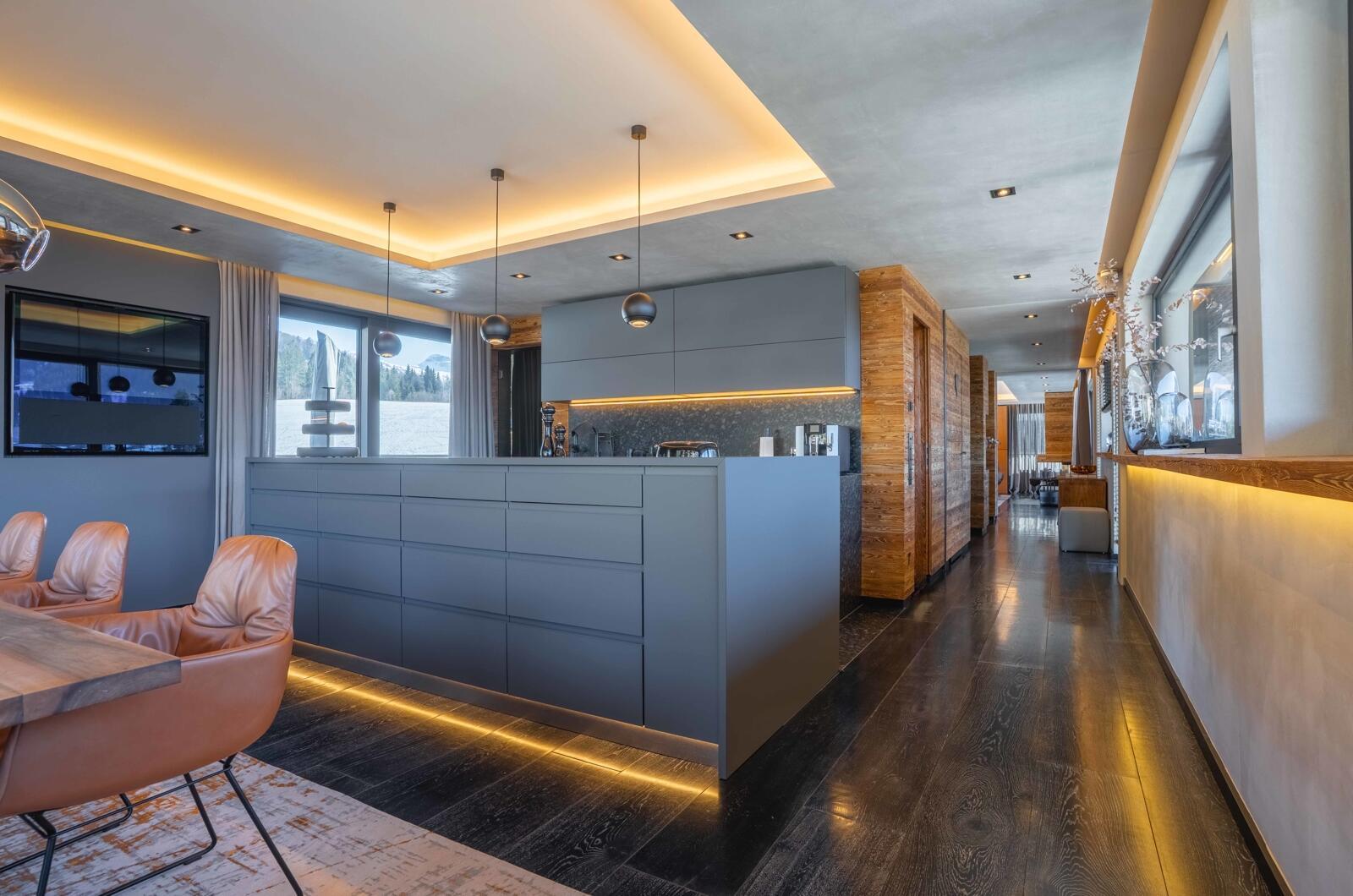 The Executive erstreckt sich über das 1. Obergeschoss und das Dachgeschoss und bietet dank großer Fensterflächen auf beiden Ebenen lichtdurchflutete Räume. Der atemberaubende 360-Grad-Panoramablick umfasst dabei auch die weltberühmte Streif – ein Highlight für jeden, der die besondere Lage zu schätzen weiß.