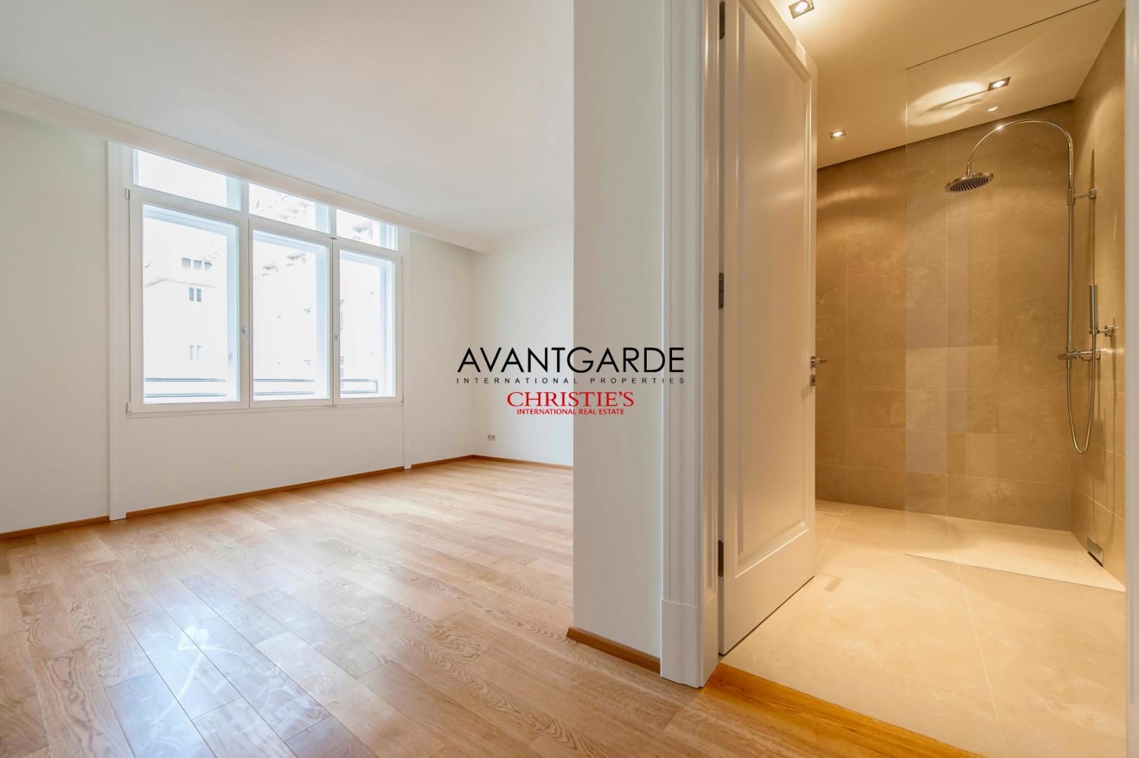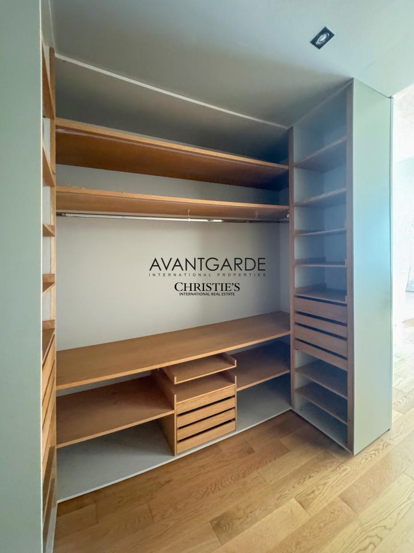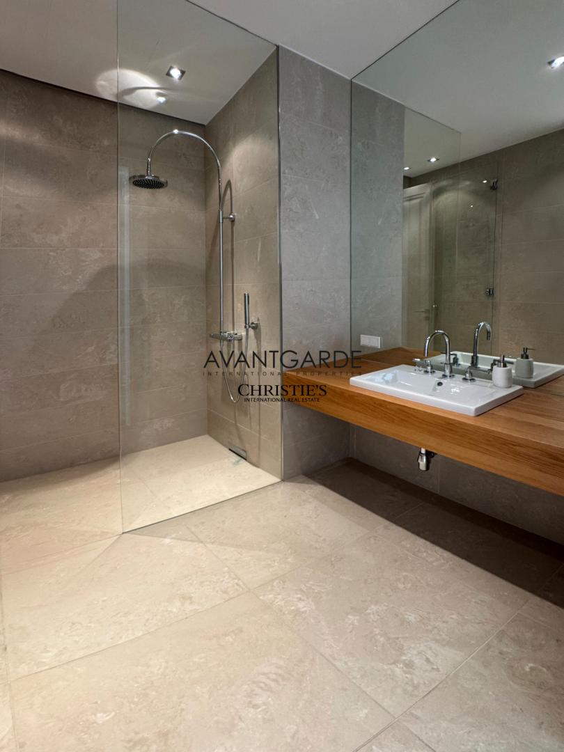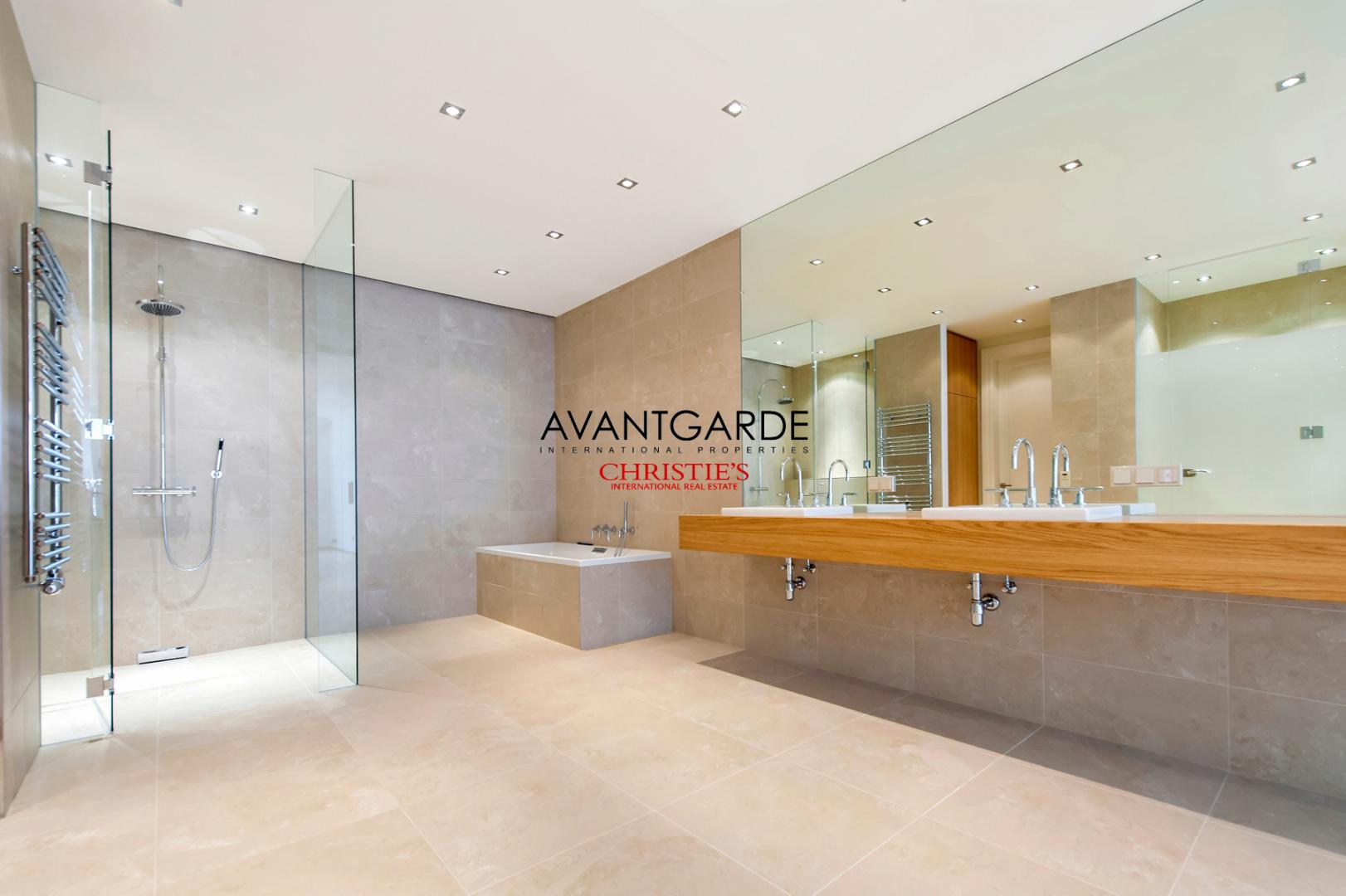 Das edle Designerbad lädt mit freistehender Wanne und Walk-in-Dusche zum täglichen Spa-Erlebnis ein, ergänzt durch einen großzügigen Schrankraum.Ein separater Wirtschaftsraum sorgt diskret für Ordnung und Hygiene.