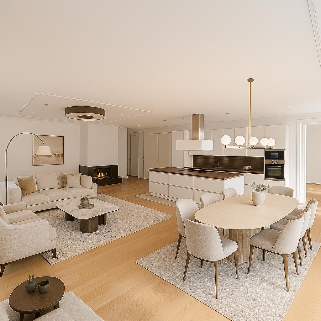 Bereits beim Eintreten empfängt Sie ein repräsentativer Vorraum, der den Blick freigibt auf den prachtvollen Wohn-Ess-Kochbereich mit offenem Kamin – ein Ort für stilvolle Empfänge und entspannte Abende gleichermaßen. Die Raumhöhe, die großen Fenster und das feine Eichenparkett schaffen ein Gefühl von Weite und Leichtigkeit.