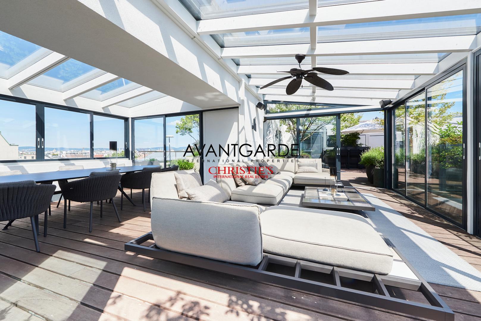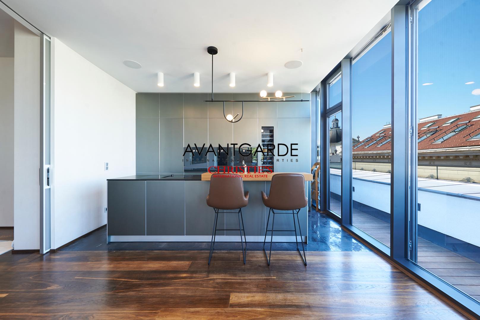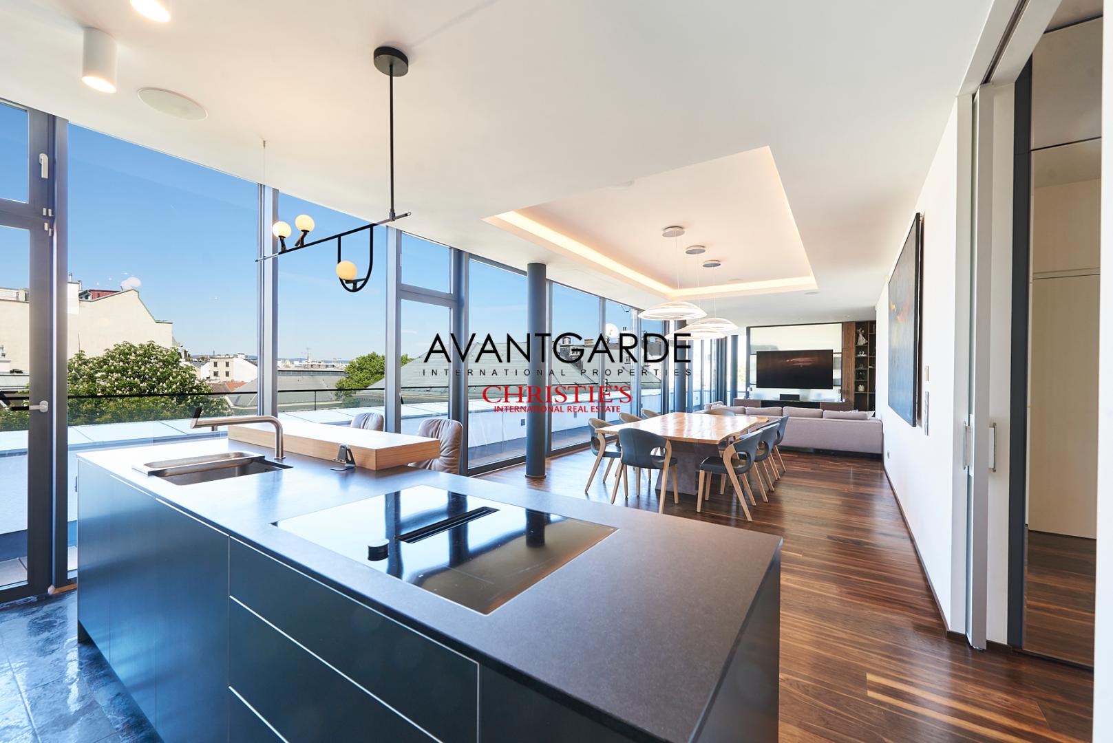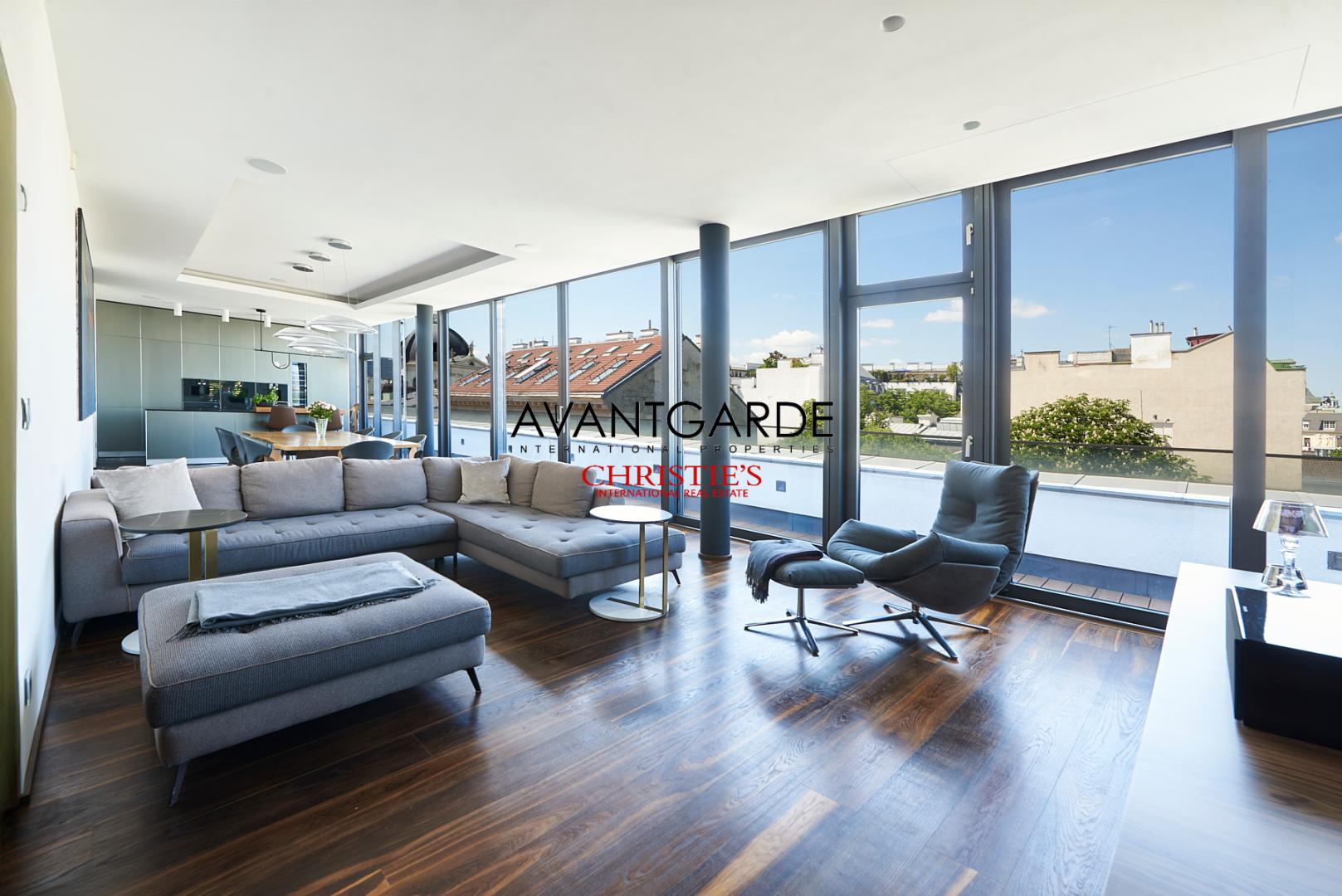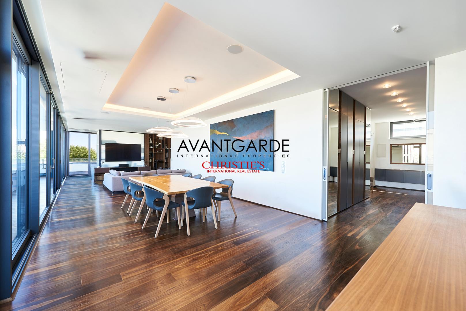 Flooded with natural light, the spacious living salon forms the centerpiece of the home. Open-plan design and floor-to-ceiling glass walls — without any sloping ceilings — underscore the modern penthouse aesthetic, seamlessly connecting the living, dining, and kitchen areas. The contemporary, high-end kitchen is harmoniously integrated and opens up to a distinguished dining space, which in turn flows into a comfortable lounge area. Adjacent to this is a refined office space, ideal for working from home while remaining discreetly separate from the main living area.