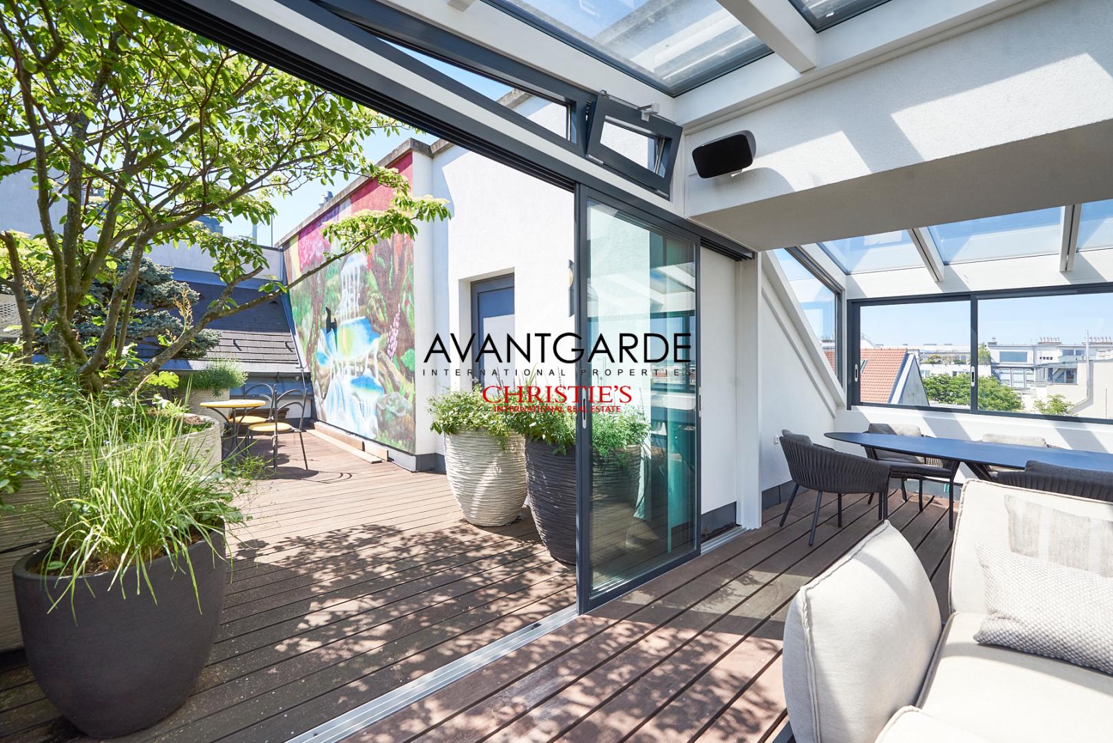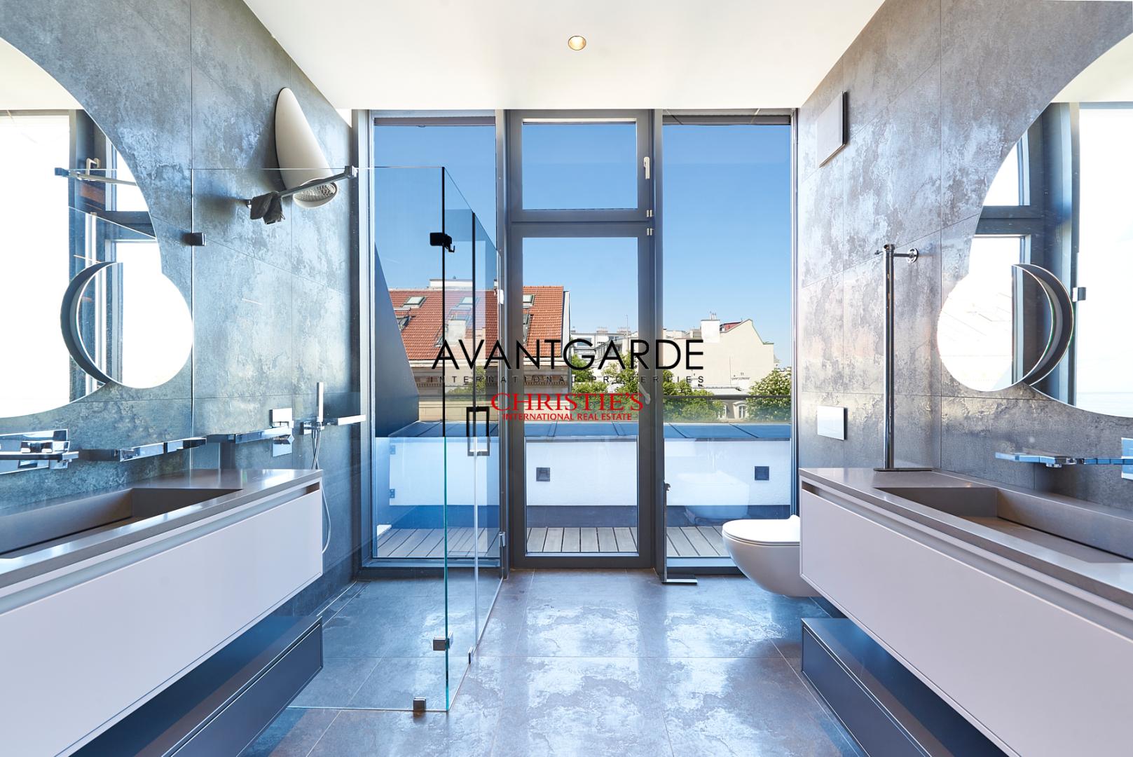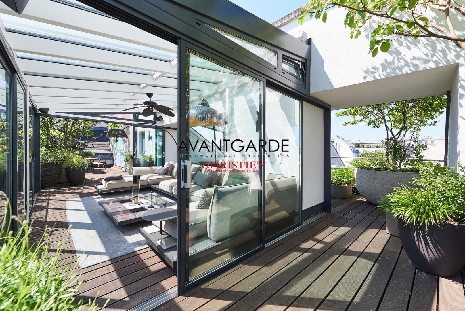 A true highlight of this residence is the wrap-around terrace, accessible directly from the main living level. It extends the living space outdoors and, thanks to its thoughtfully arranged greenery, serves as a private oasis in the heart of the city.